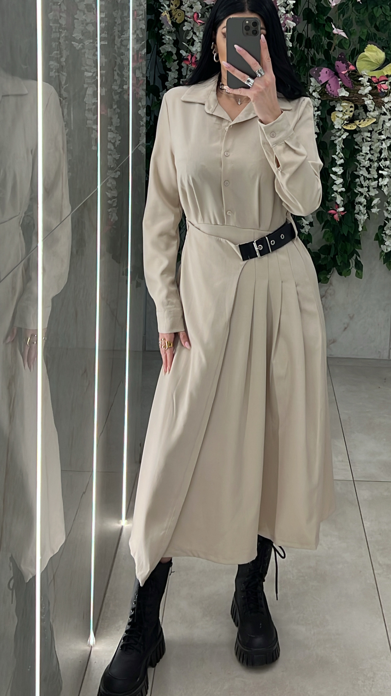 Φόρεμα με λάστιχο στην μέση και ζώνη που ρυθμίζεται ,έχει γιακά και κλείνει με κουμπιά μπροστά.