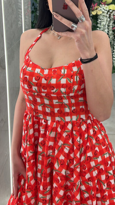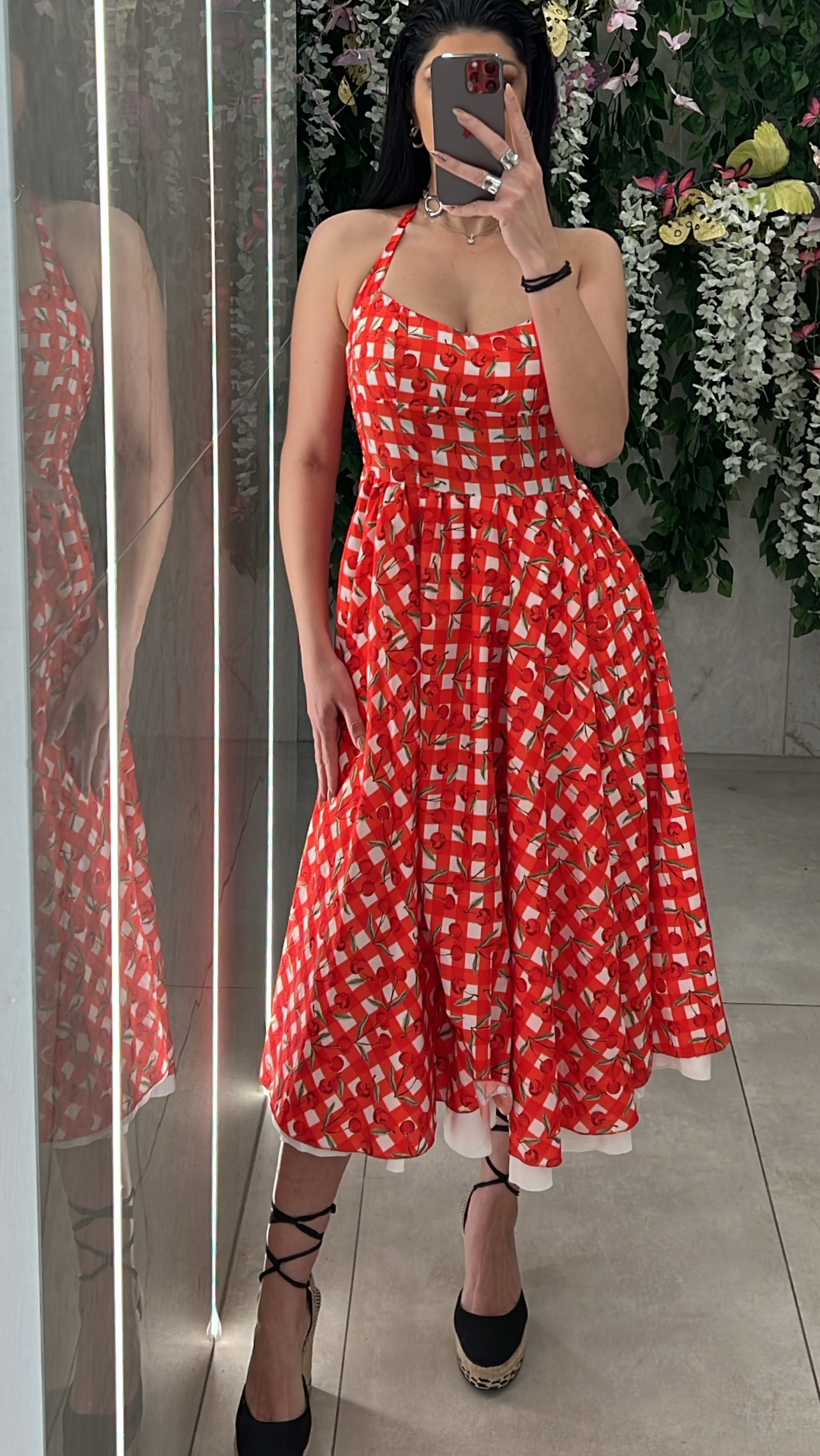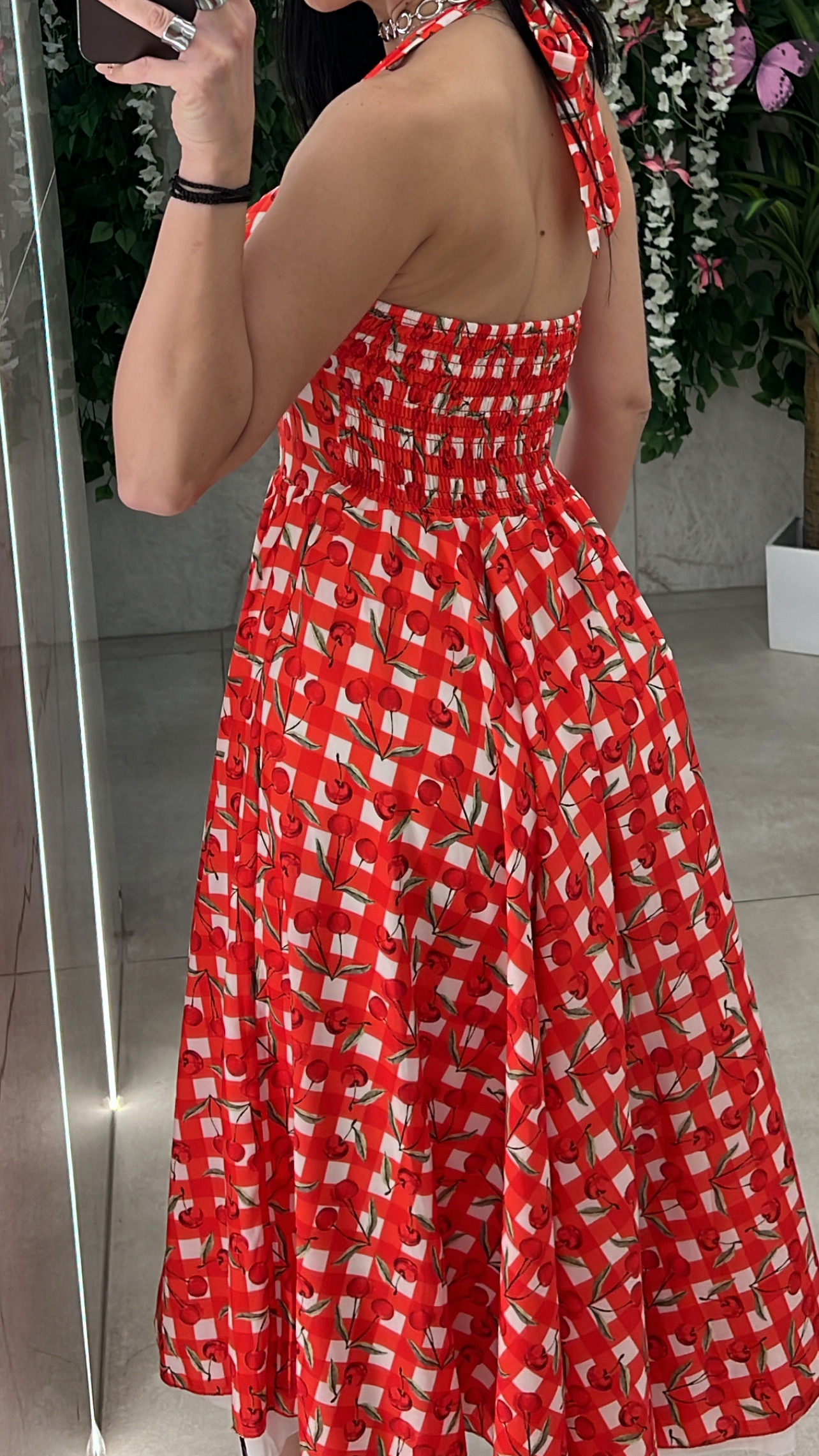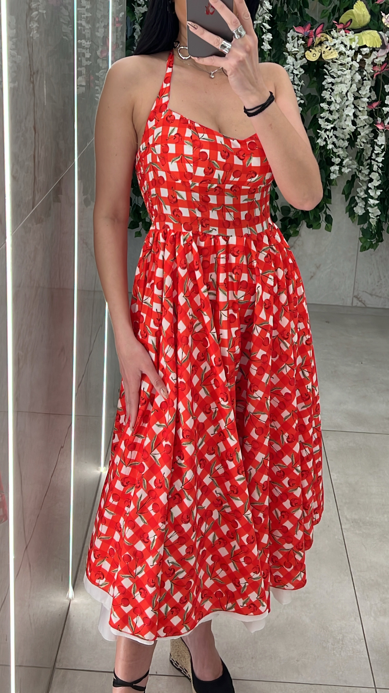 Φόρεμα καρό με σχεδιο κεράσια , διαθετει καπς στο στήθος , λάστιχο στην πλάτη , δένει στον λαιμο και εχει διπλο υφασμα στην φουστα το οποιο προεξέχει στο τελειωμα .