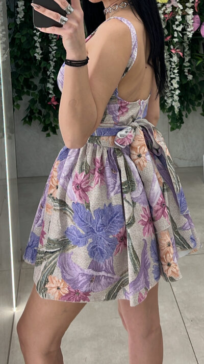 Φόρεμα κοντό με ανοιχτή πλάτη, κλείνει με φερμουάρ και κορδέλα στο πίσω μέρος της μέσης και διαθέτει καπς στο στήθος.