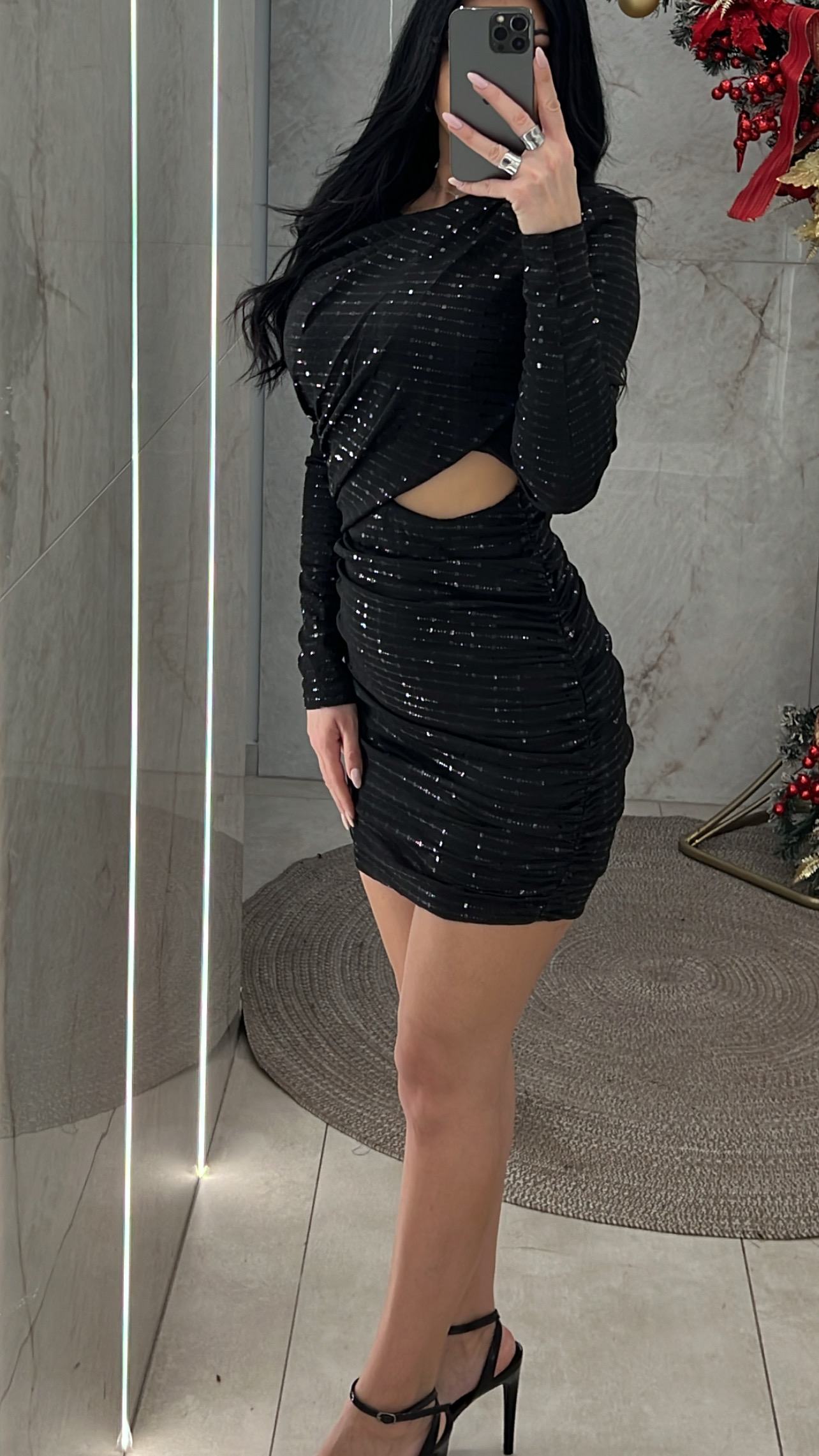 Φόρεμα κοντό με μαύρη παγιέτα έχει σκίσιμο στην μέση και διαθέτει βάτες