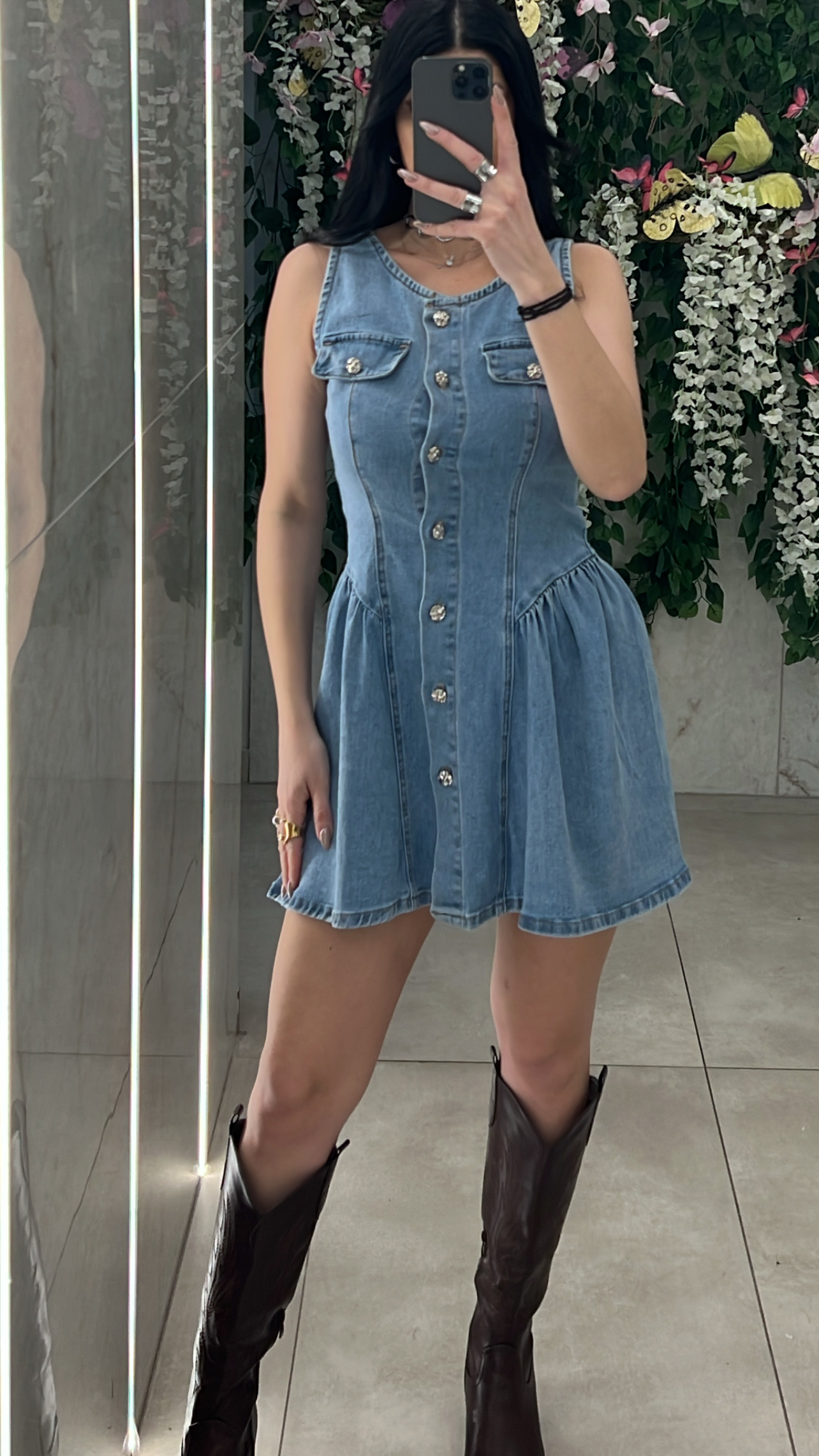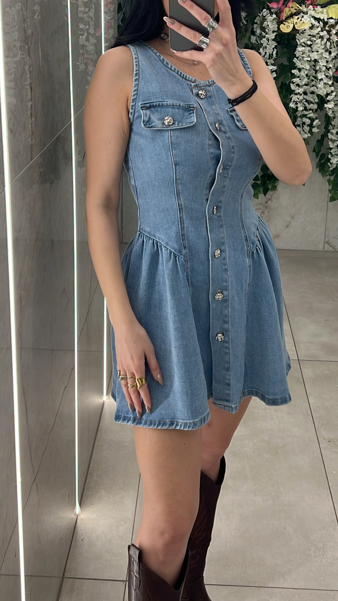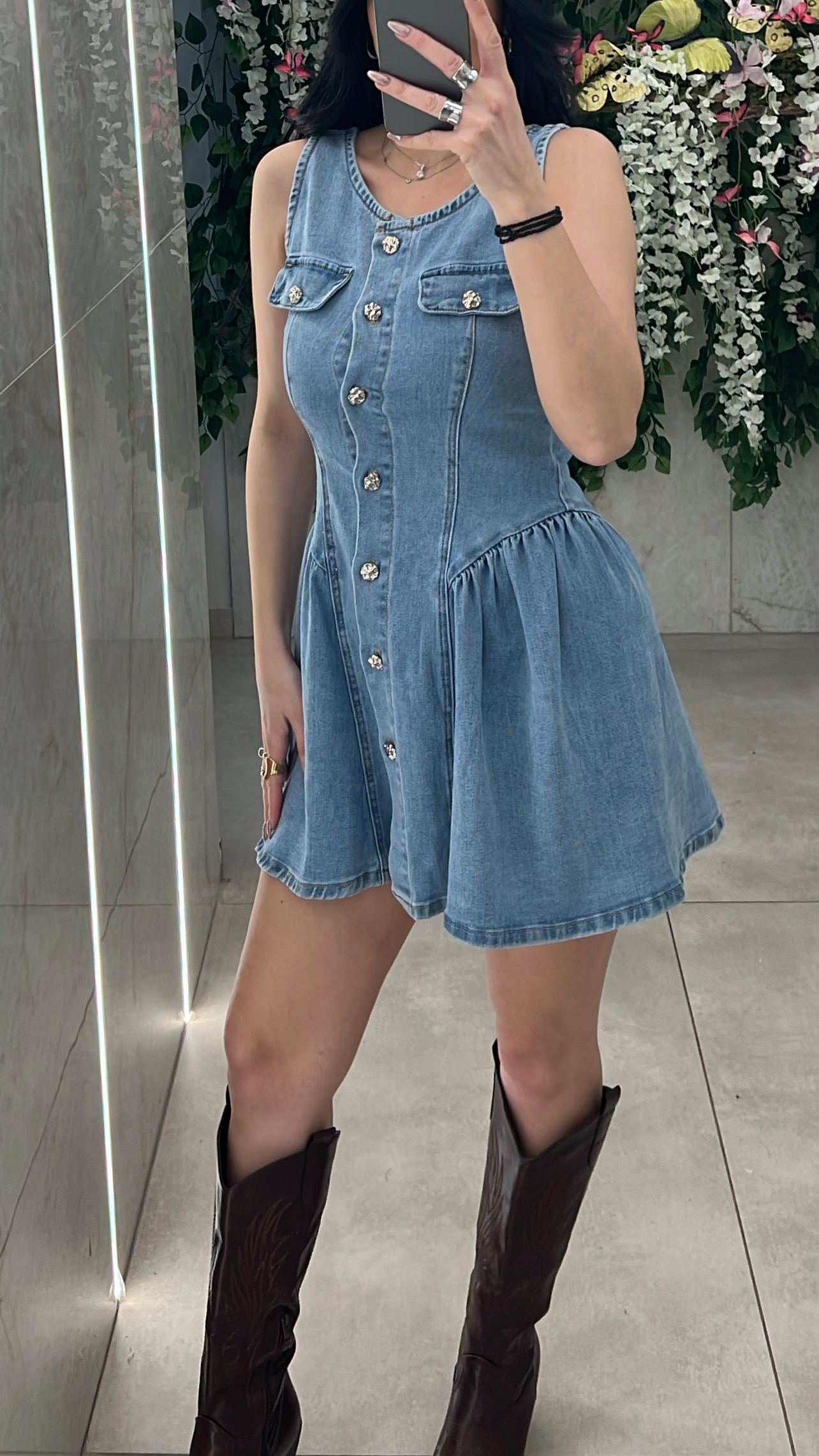 Φορεμα τζιν κοντο , κλεινει με κουμπια και εχει διακοσμητικες τσέπες .