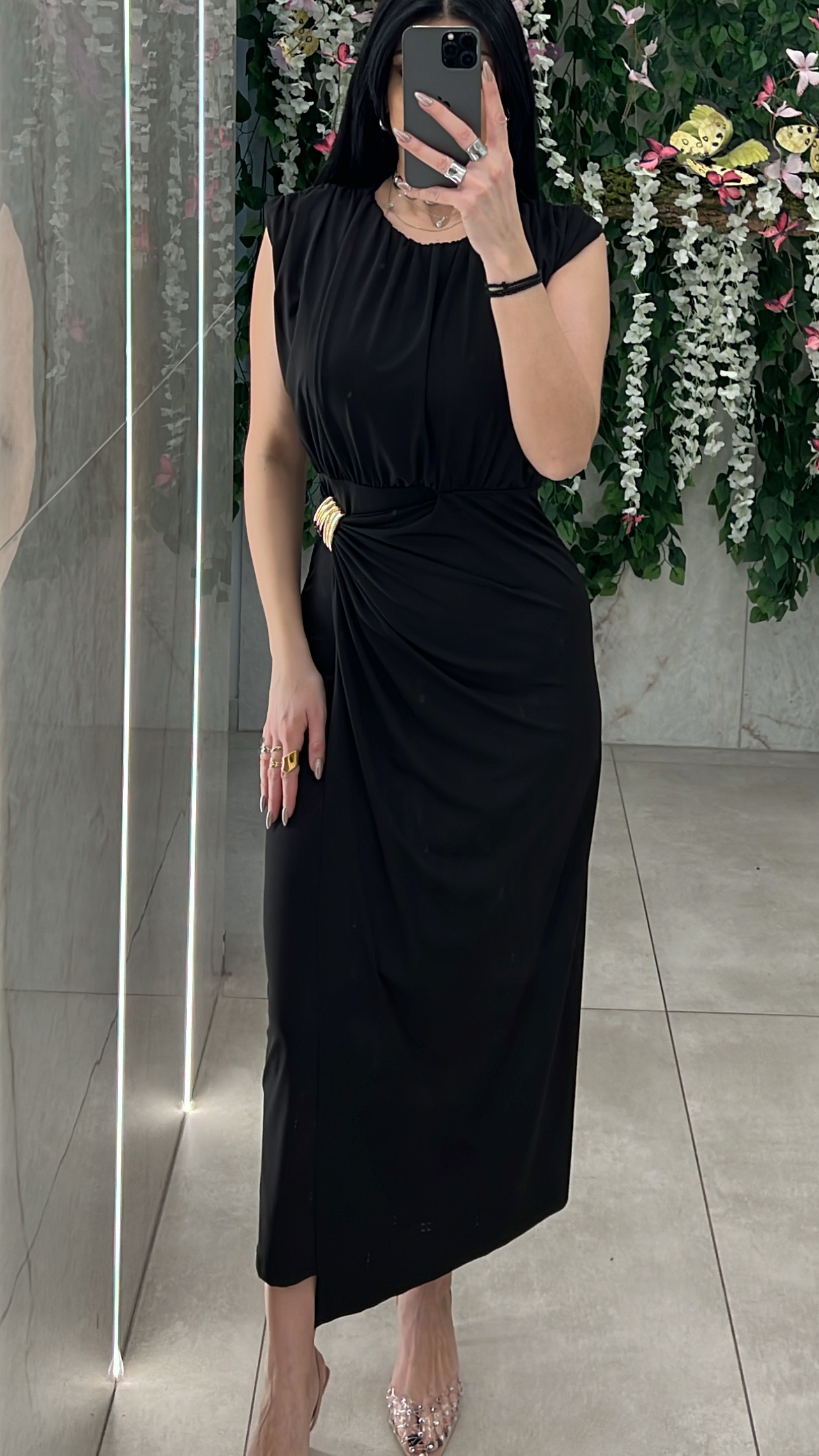 Φόρεμα μακρύ με λαιμόκοψη και χρυσή λεπτομέρεια στην μέση , διαθέτει ύφασμα που πέφτει μπροστά σαν φάσα .