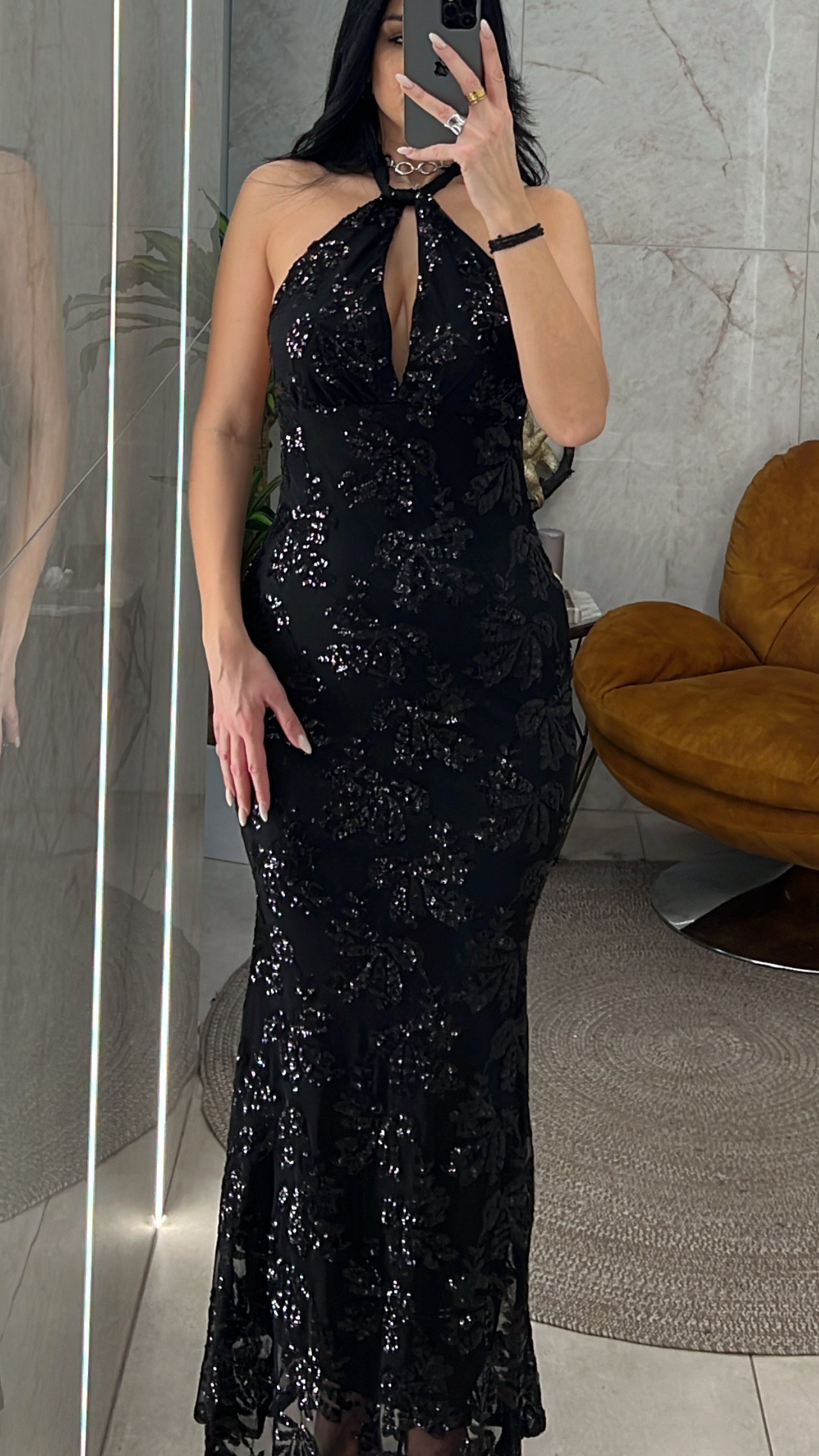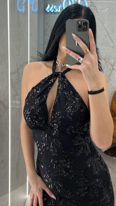 Φόρεμα με παγιέτα με βαθύ ντεκολτέ δένει στο λαιμό και έχει ανοιχτή πλάτη