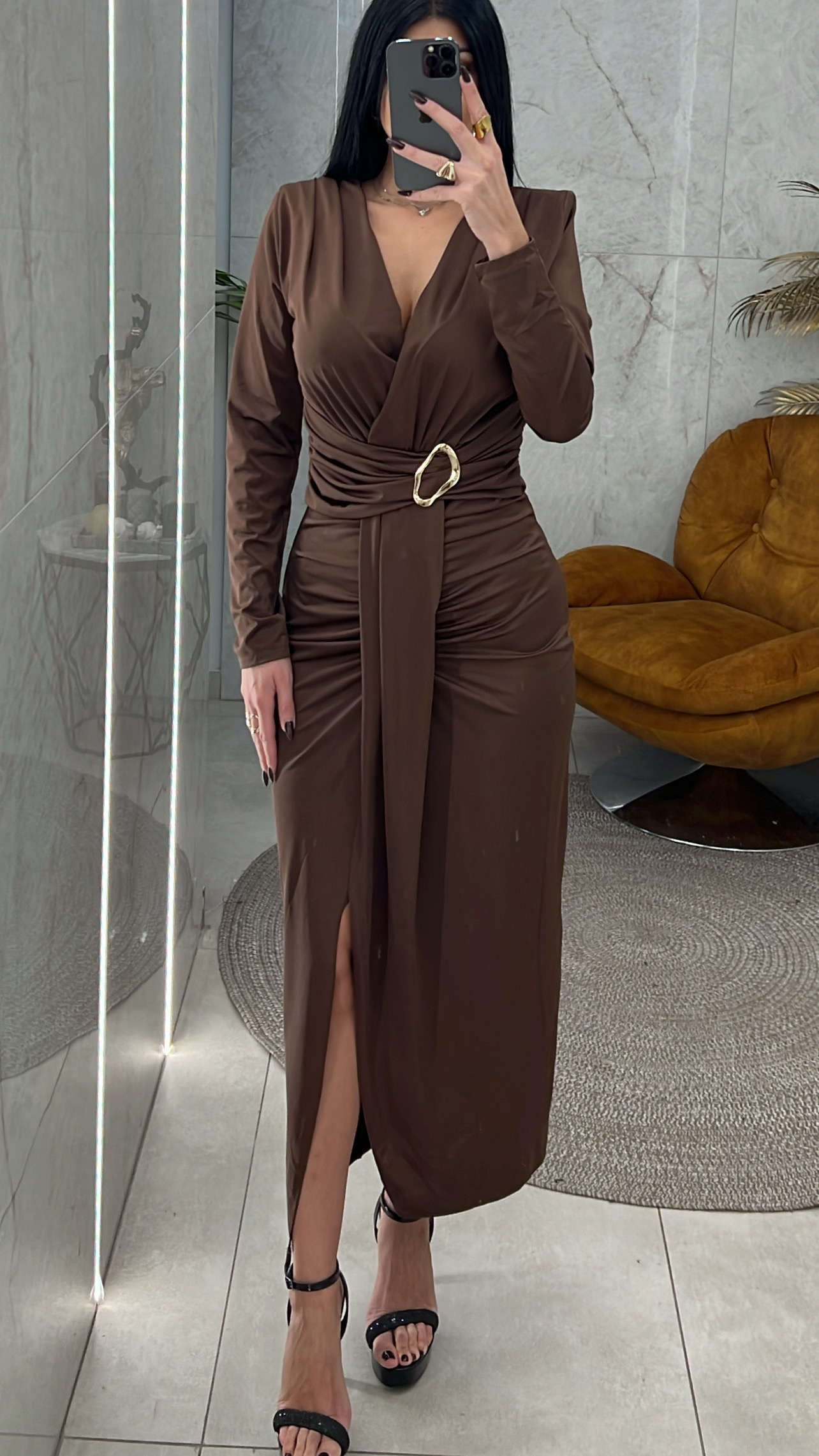Φόρεμα maxi  με σκίσιμο V στο στήθος αγκράφα χρυσή μπροστά