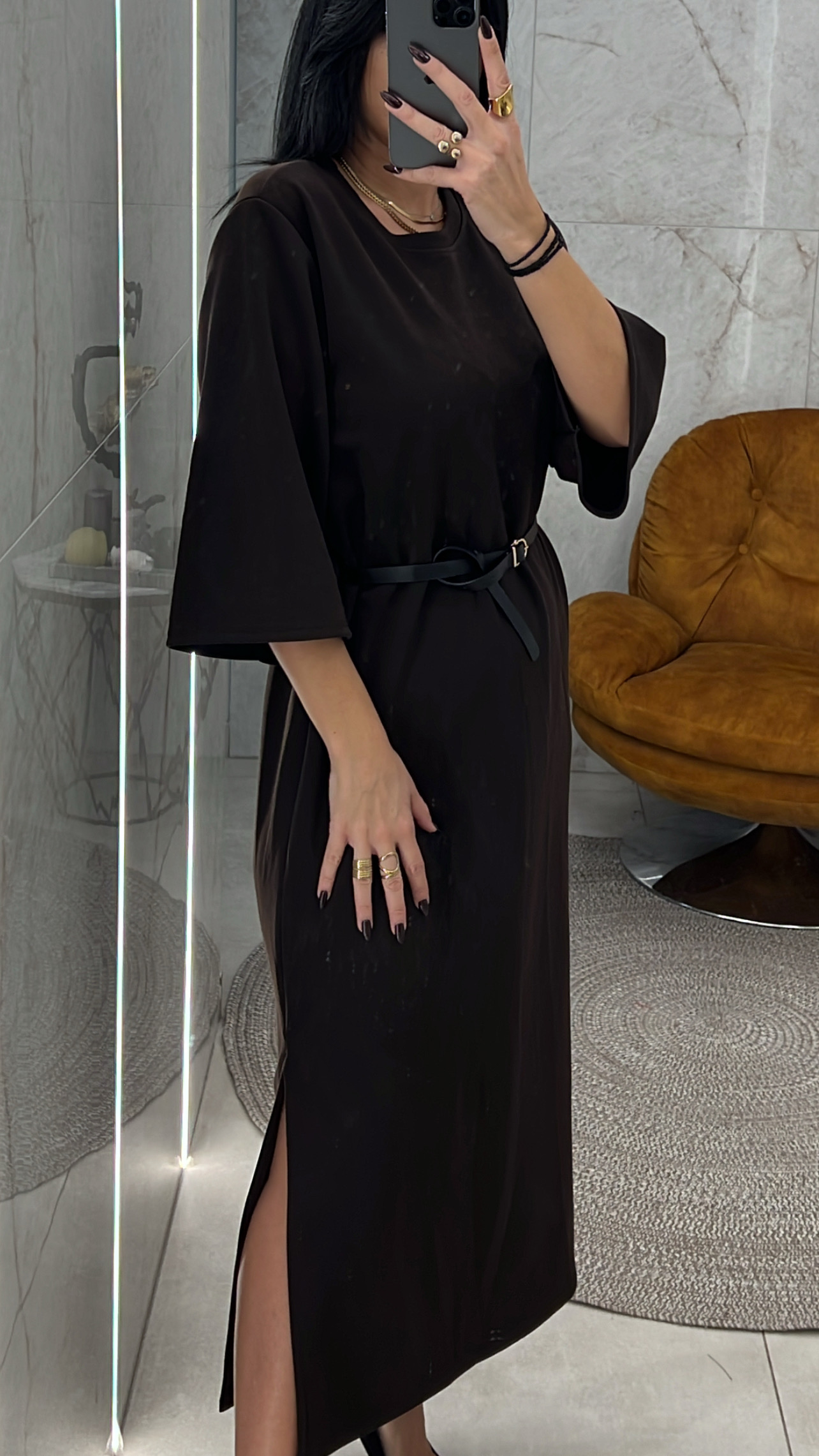 Φόρεμα μακρύ με ζωνάκι και άνοιγμα στο πόδι.