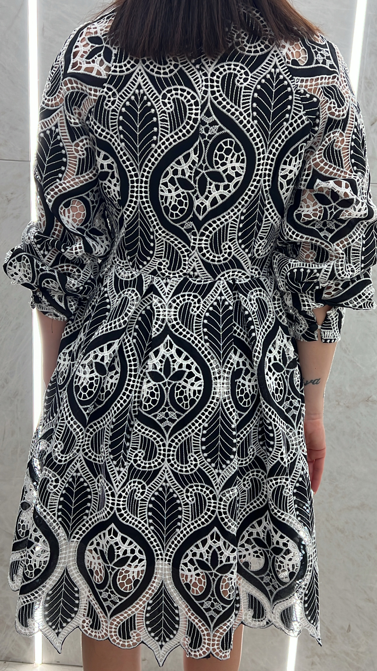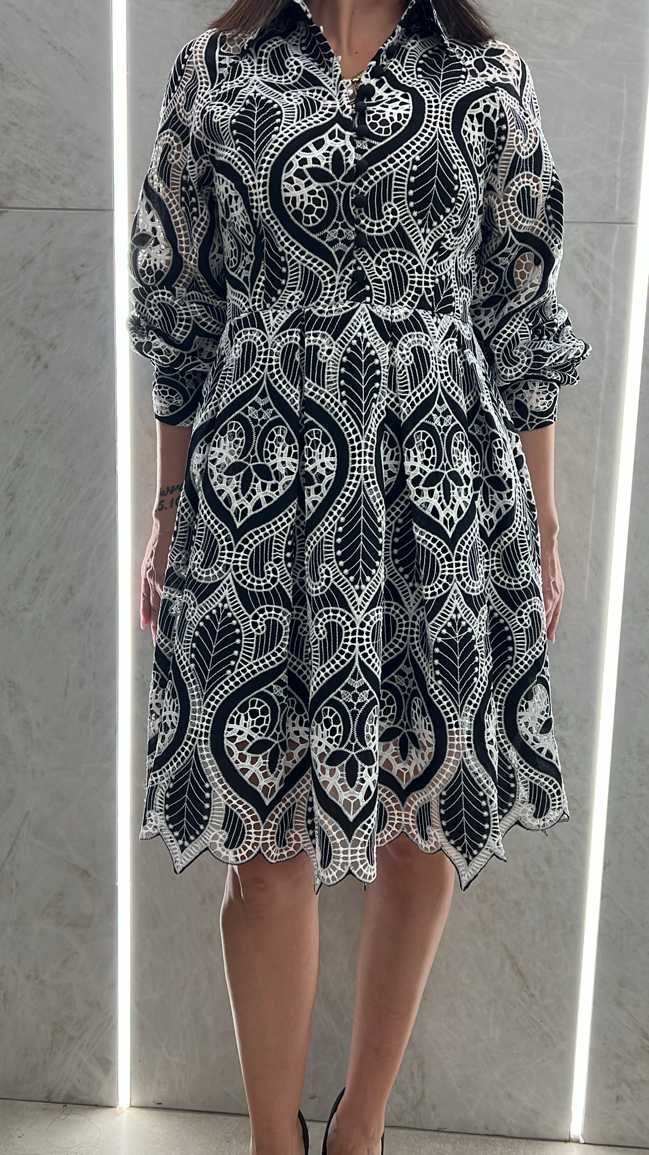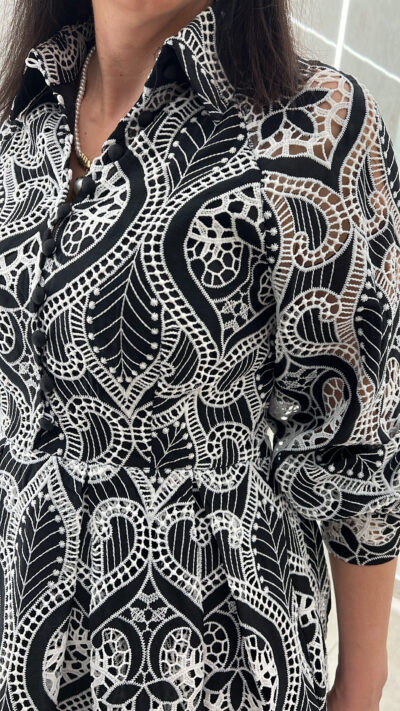 Φόρεμα με δαντέλα ,κλεινει με κουμπια μπροστα και φερμουάρ στο πλάι ,ειναι φοδραρισμένο και εχει γιακά.