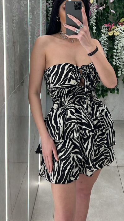 Φόρεμα με print , εχει λάστιχο στην μέση και στην πλατηβ , κανει βολαν στην φουστα και δένει στον λαιμο.