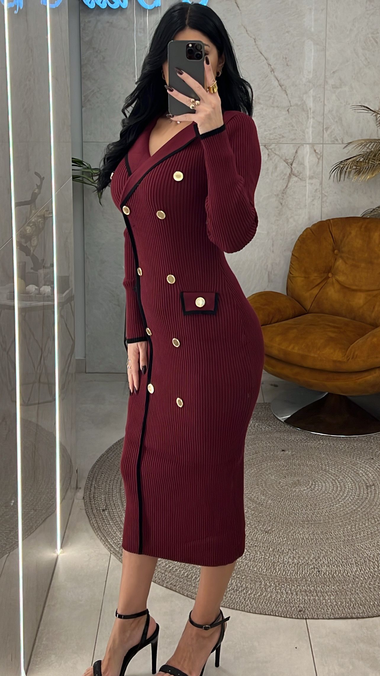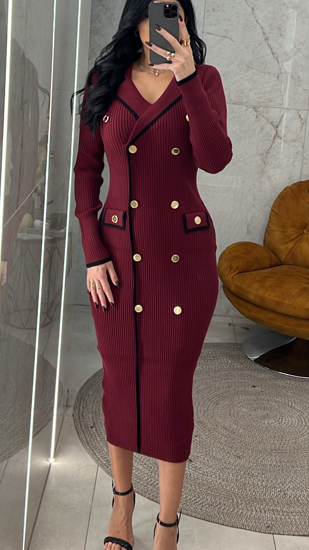 Φόρεμα πλεκτό με γιακά διακοσμητικά χρυσά κουμπιά και διακοσμητικές τσέπες μπροστά