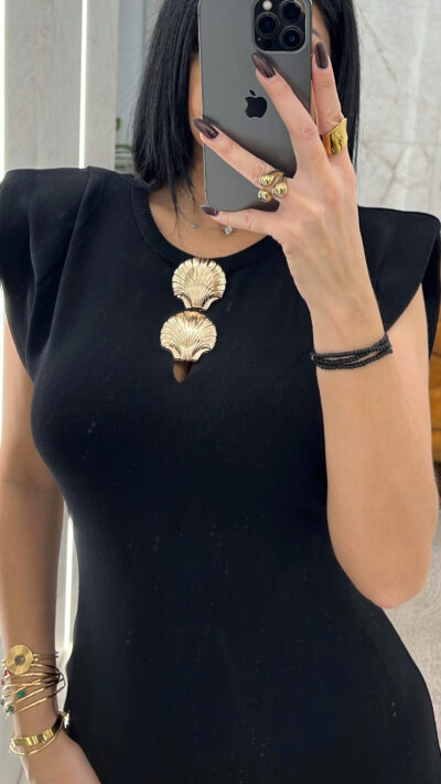 Φόρεμα πλεκτό Midi με σκίσιμο στο πίσω μέρος βάτες και διακοσμητικά χρυσά κοχύλια στο στήθος με δύο πολύ μικρά ανοίγματα