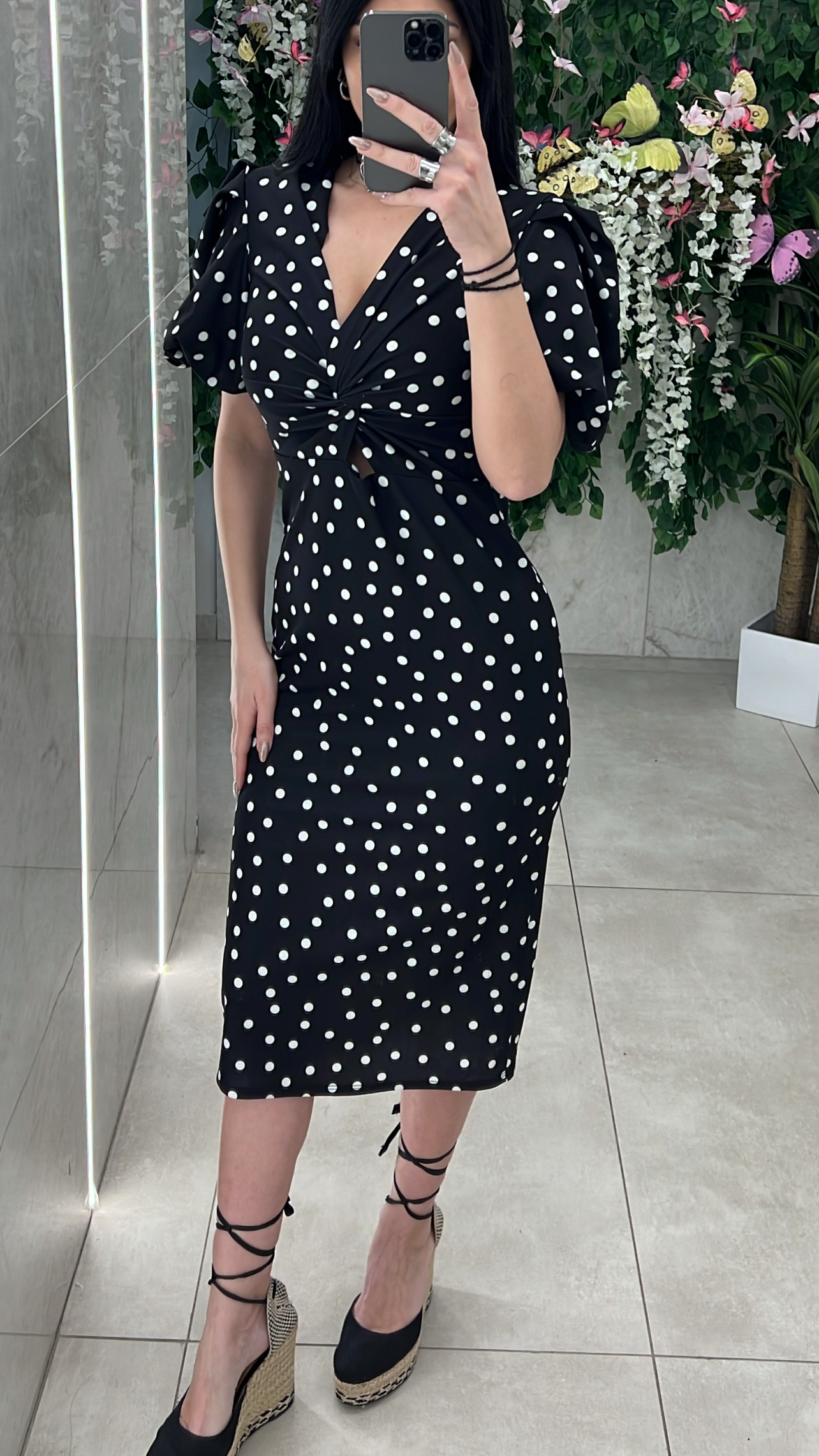 Φόρεμα πουα κοντομανικο ,με ανοιγμα και κομπο στο στηθος και λαστιχο στο τελειωμα των μανικιων .