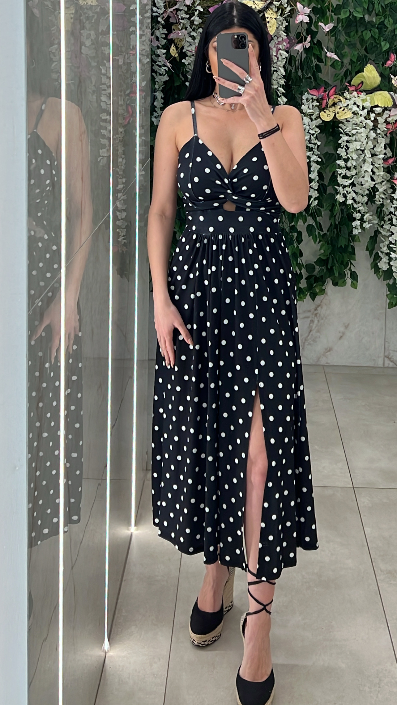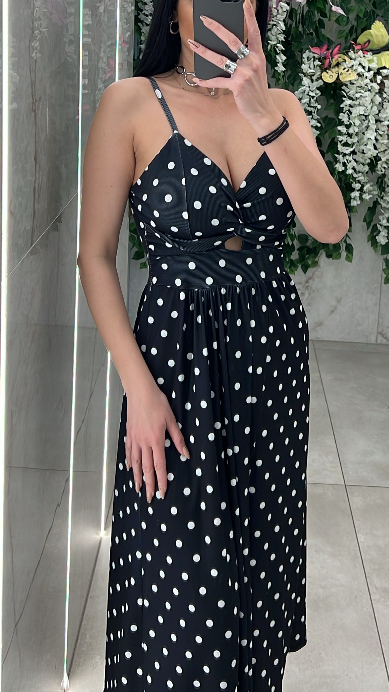 Φόρεμα ριπ πουα με τιραντες  , εχει σκισιμο στο ποδι , καπς και ανοιγμα στο στηθος .