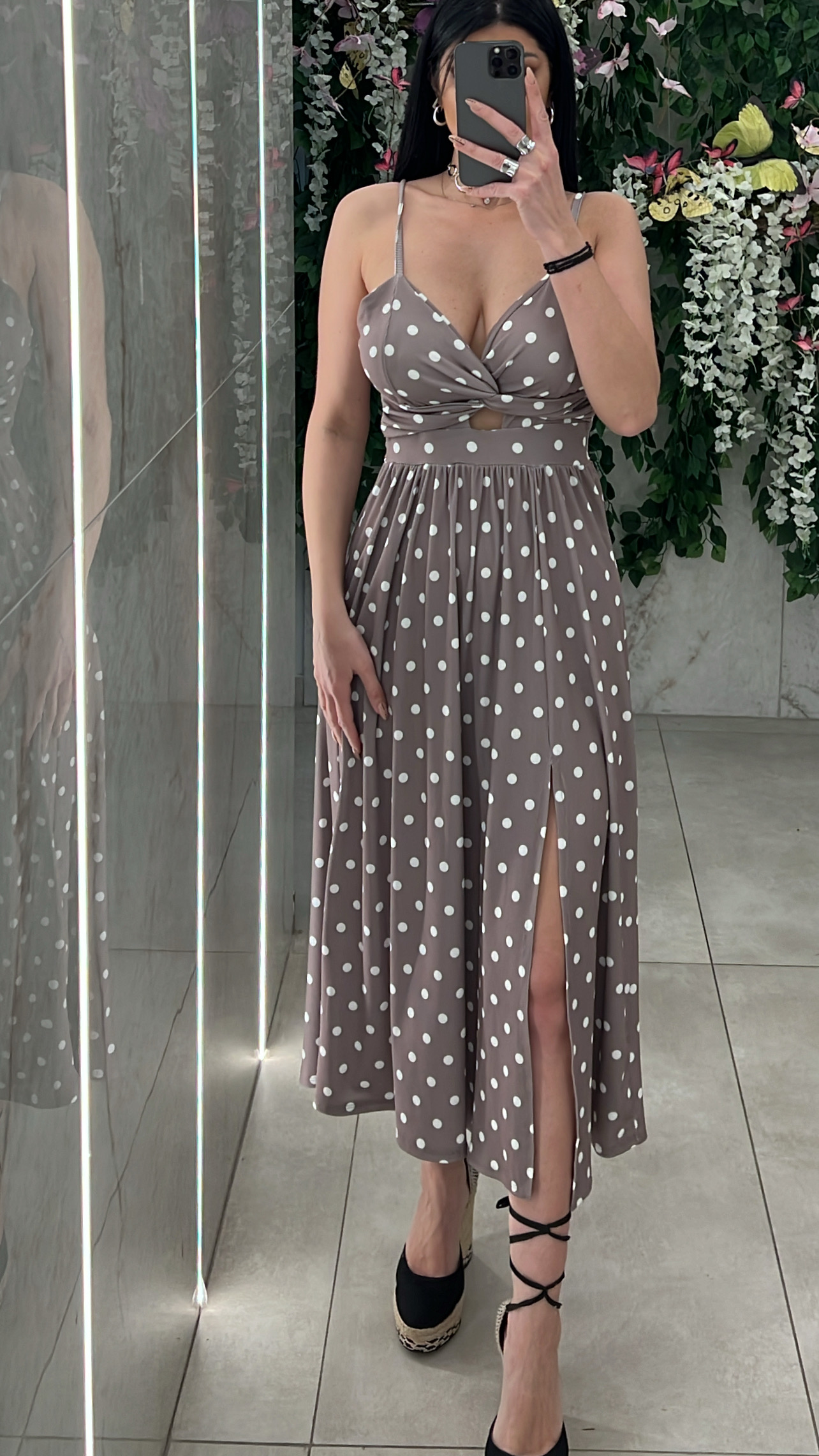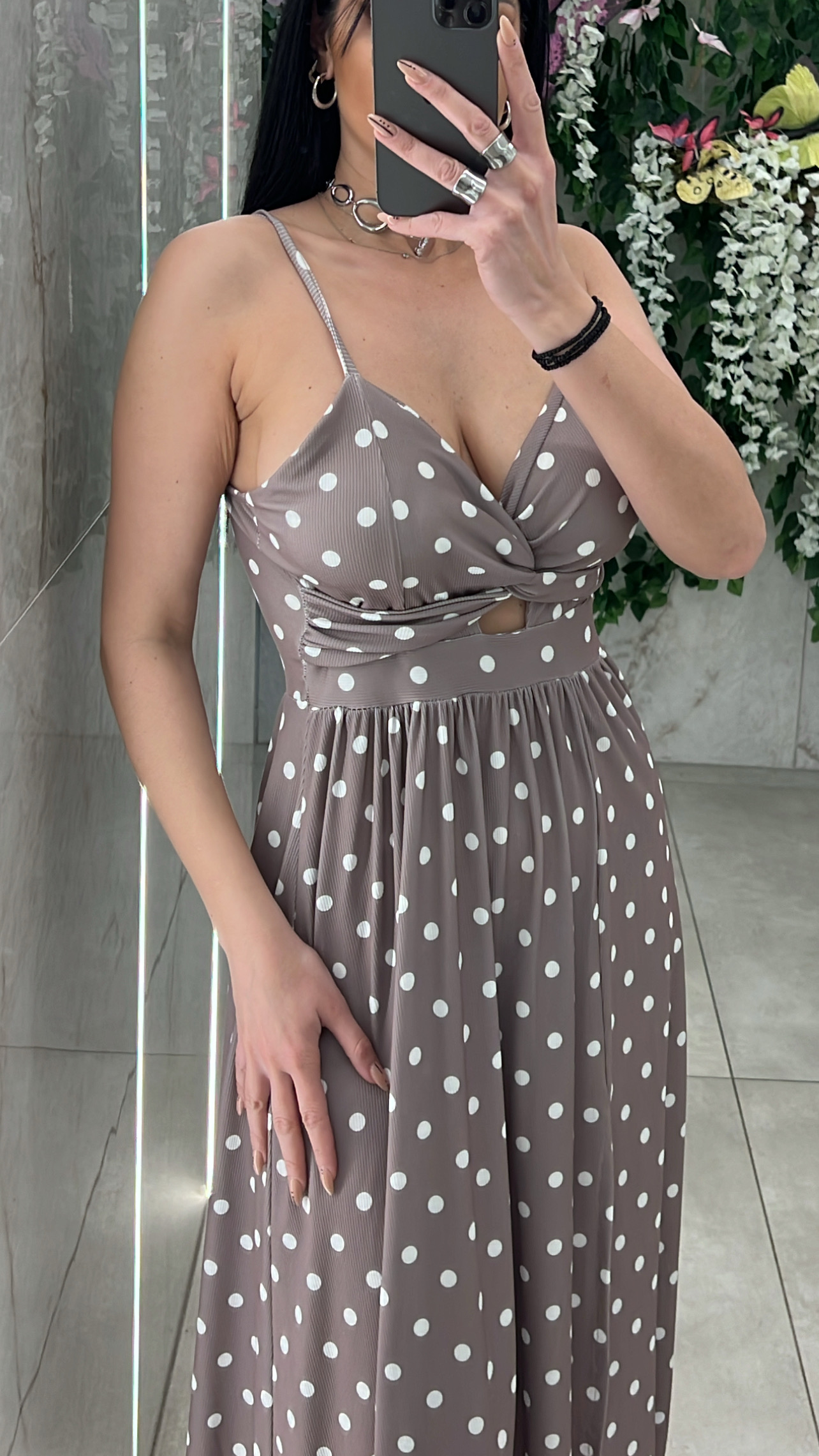 Φόρεμα ριπ πουα με τιραντες  , εχει σκισιμο στο ποδι , καπς και ανοιγμα στο στηθος .