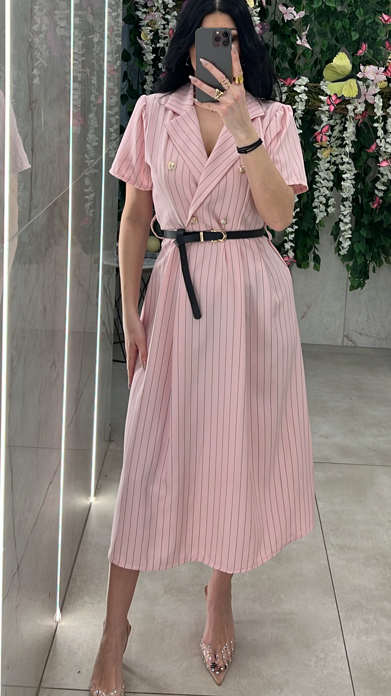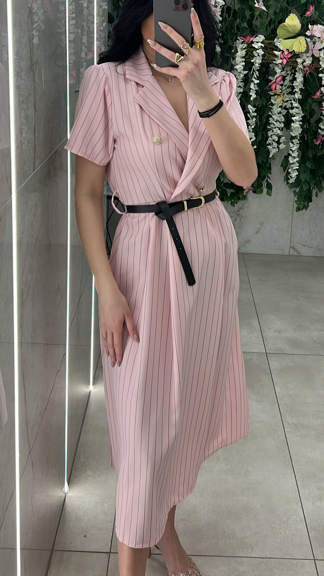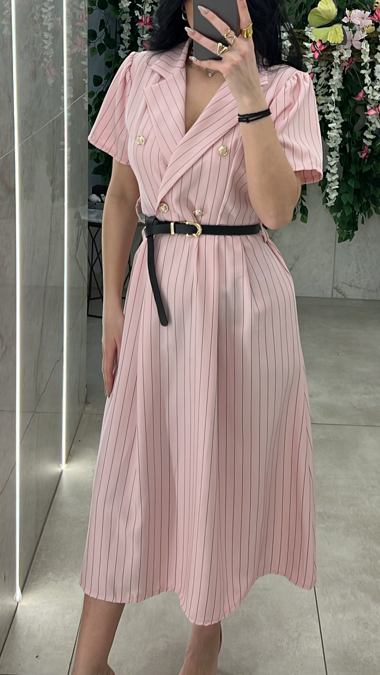 Φόρεμα ριγε κοντομάνικο ,με δικη του ζώνη ,χρυσα κουμπιά ,γιακα ,εχει πγιετες μπροστα και λάστιχο στην μέση .