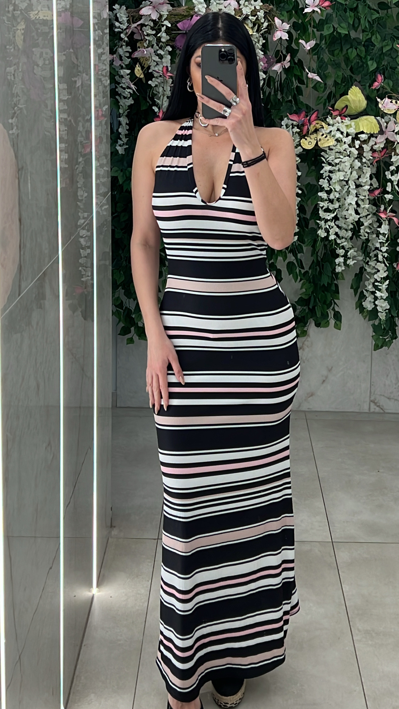 Φόρεμα ριπ ριγε , δένει στον λαιμο , με καπς στο στήθος και εχει ανοιχτη πλατη .
