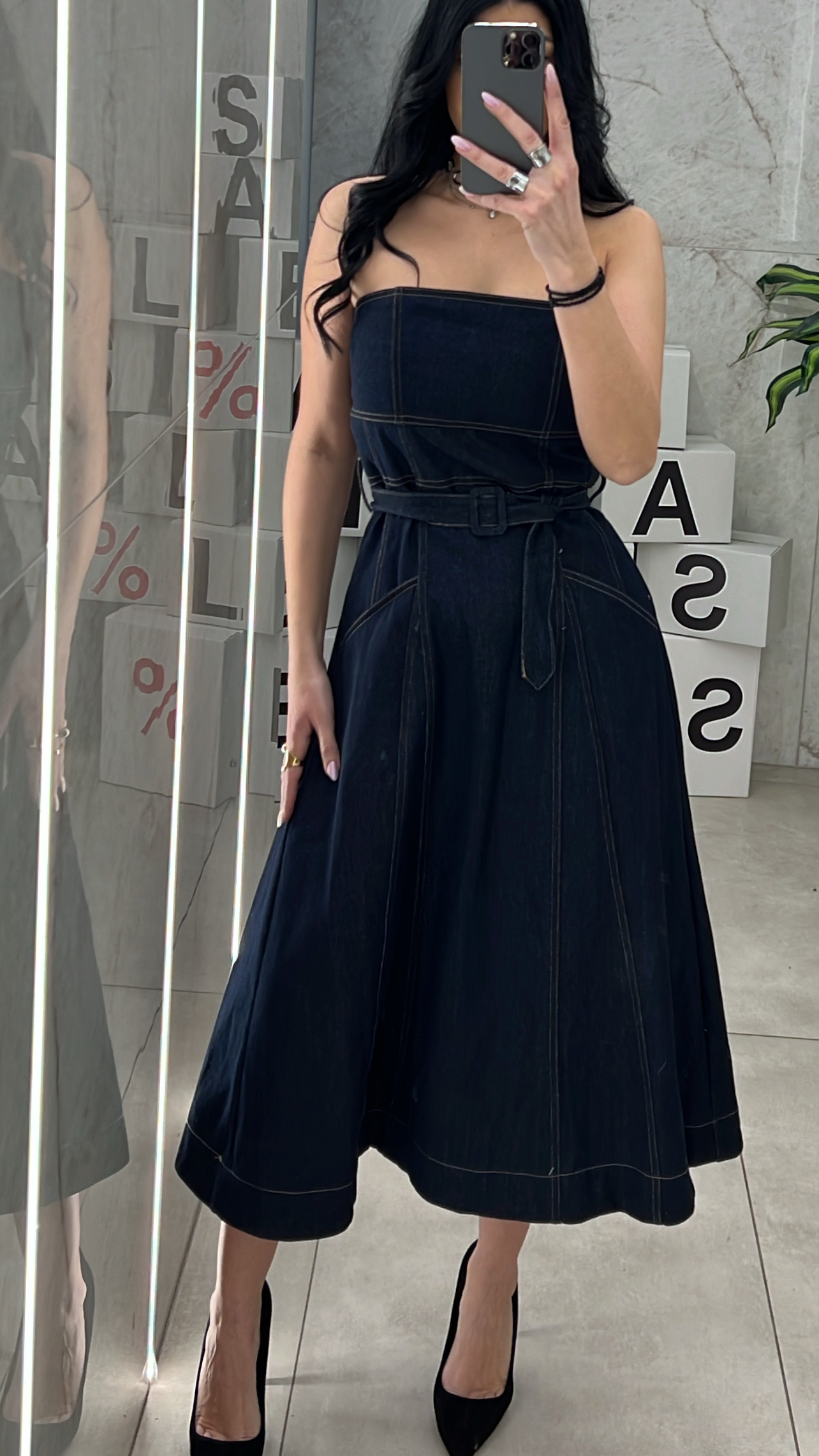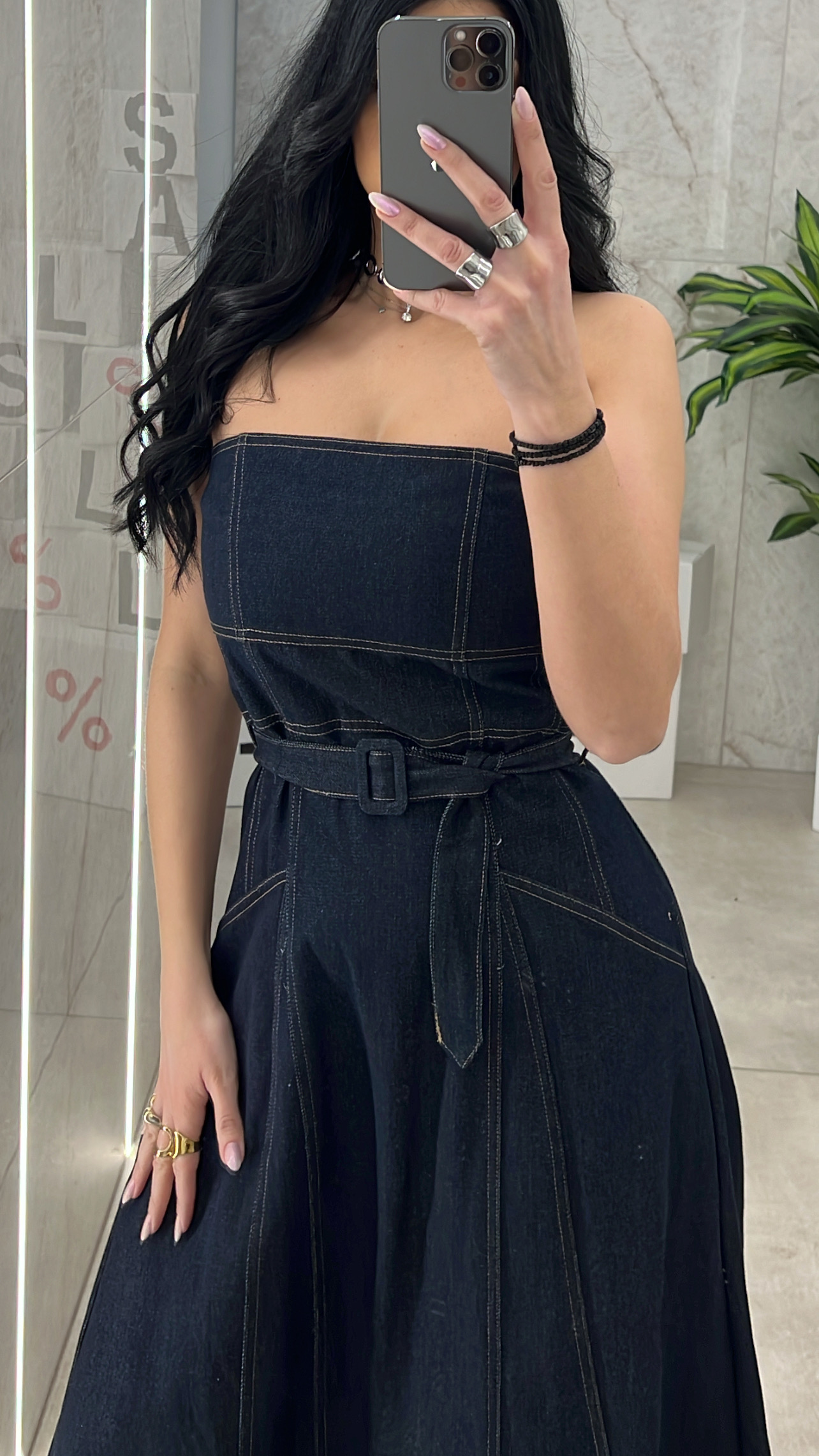 Φόρεμα στράπλες τζιν με δική της ζώνη , κλείνει με φερμουάρ στην πλάτη και εχει τσέπες.