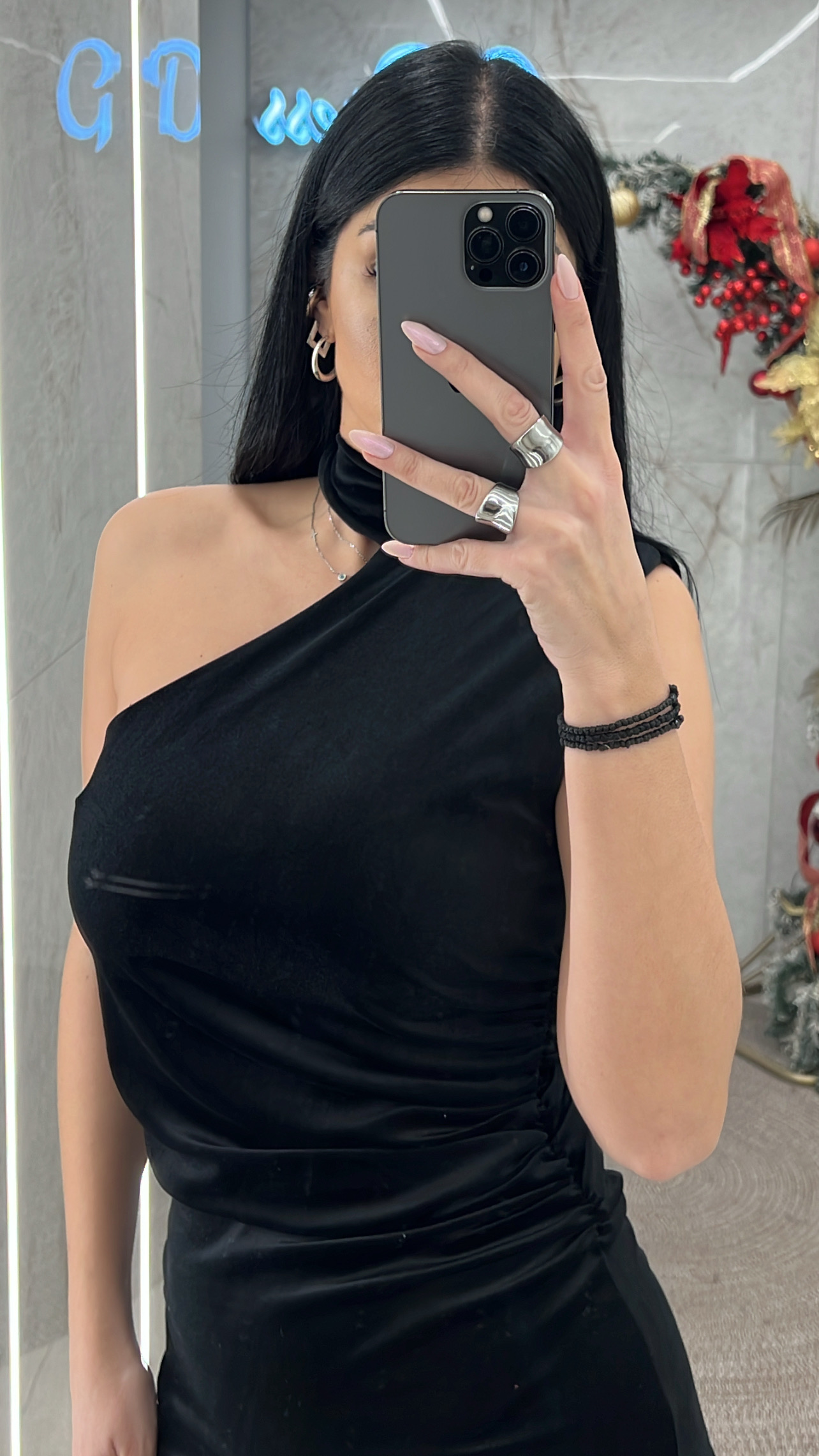 Φόρεμα βελουτέ με βάτες στον ένα ώμο και κάνει σα κασκόλ στο λαιμό και σούρες στο πλάι