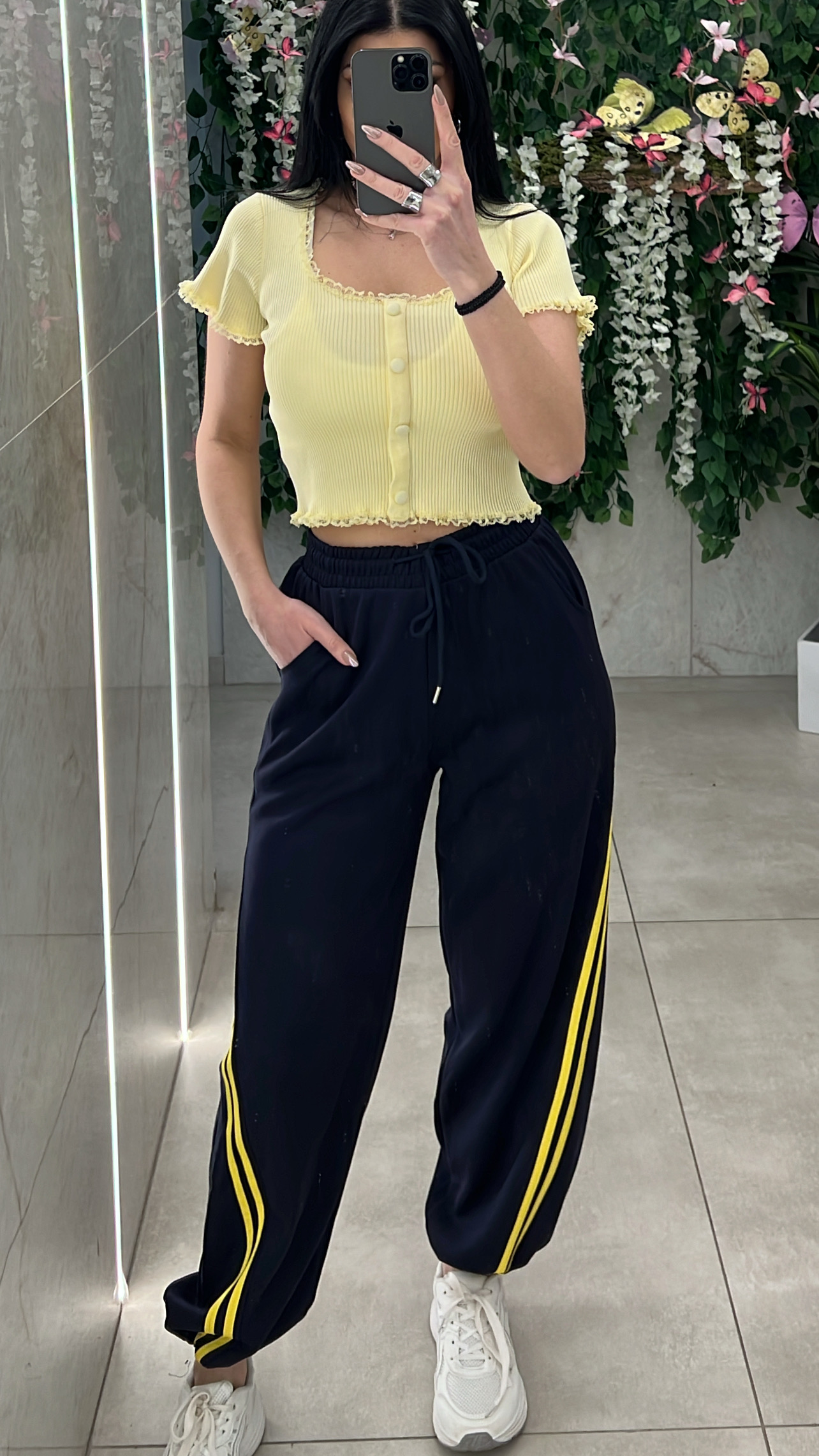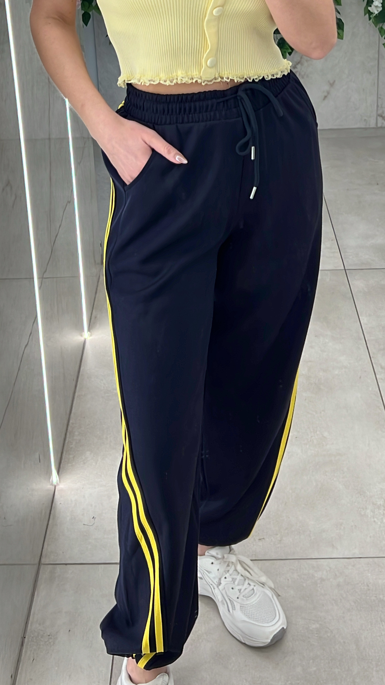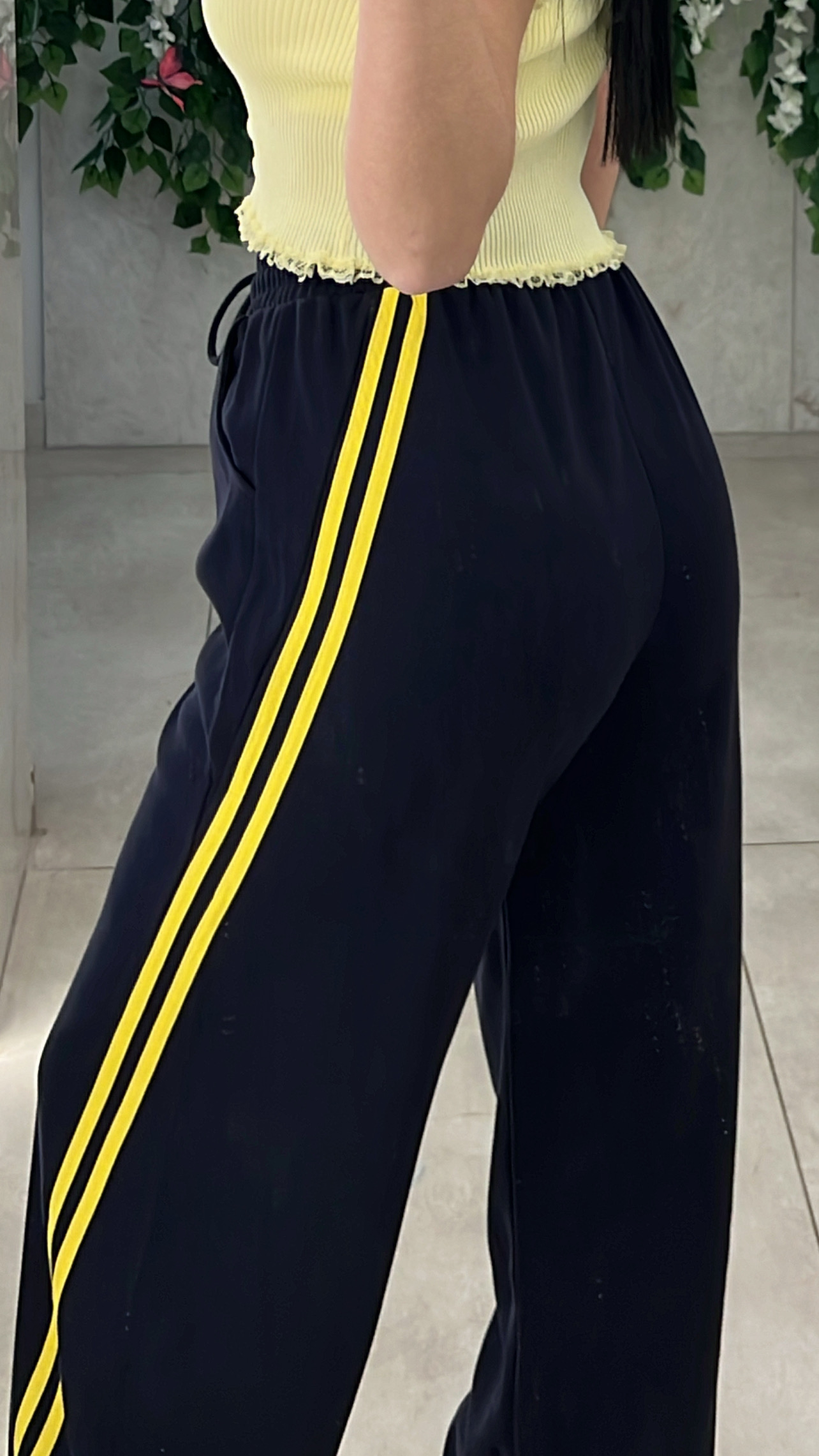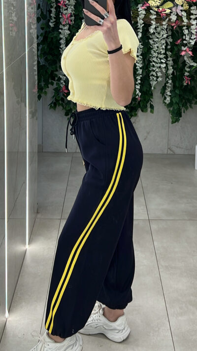 Φόρμα με ριγα κιτρινη ,διαθέτει κορδόνι ,λάσχιχο στην μέση και στο τελειωμα.