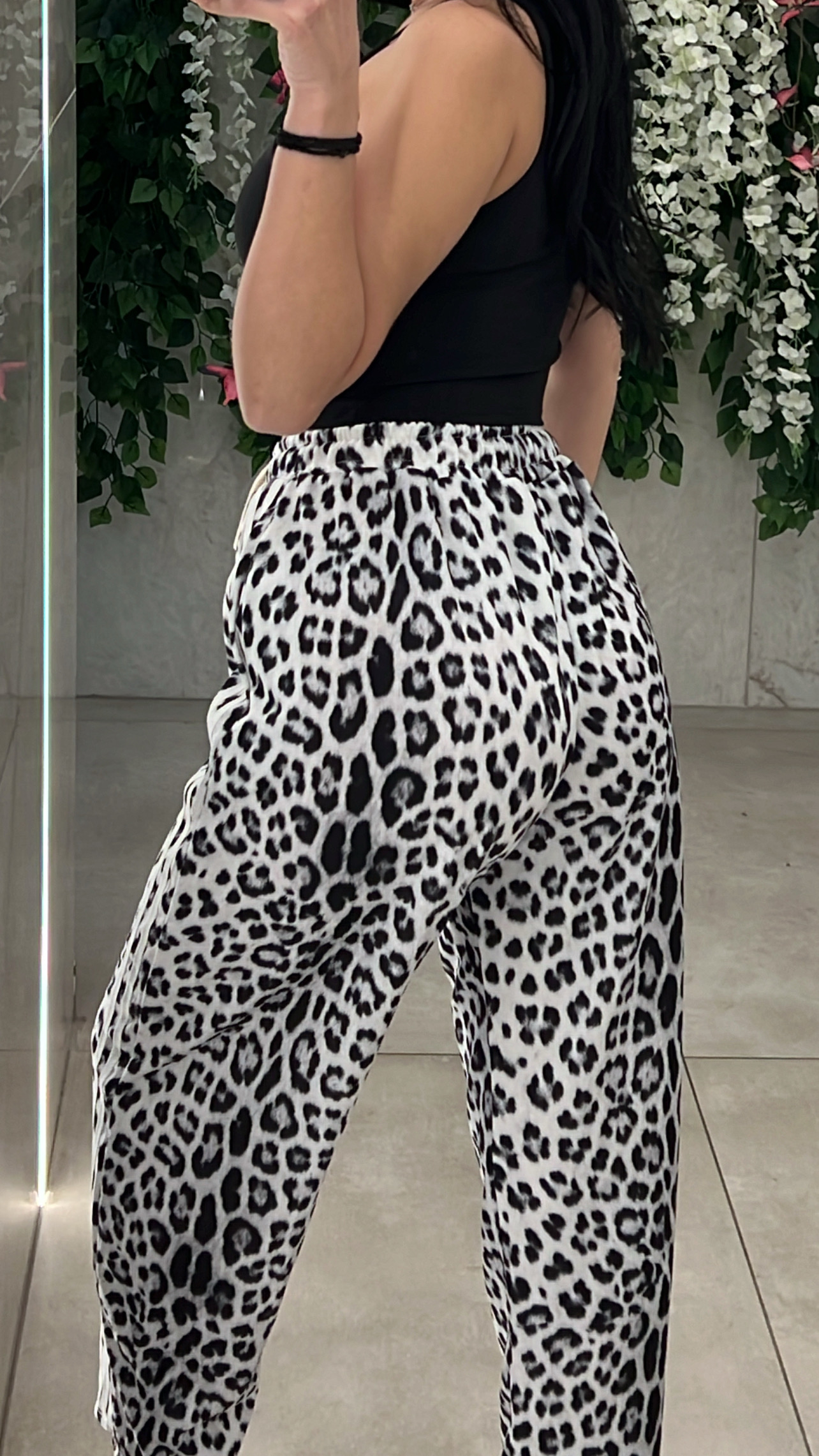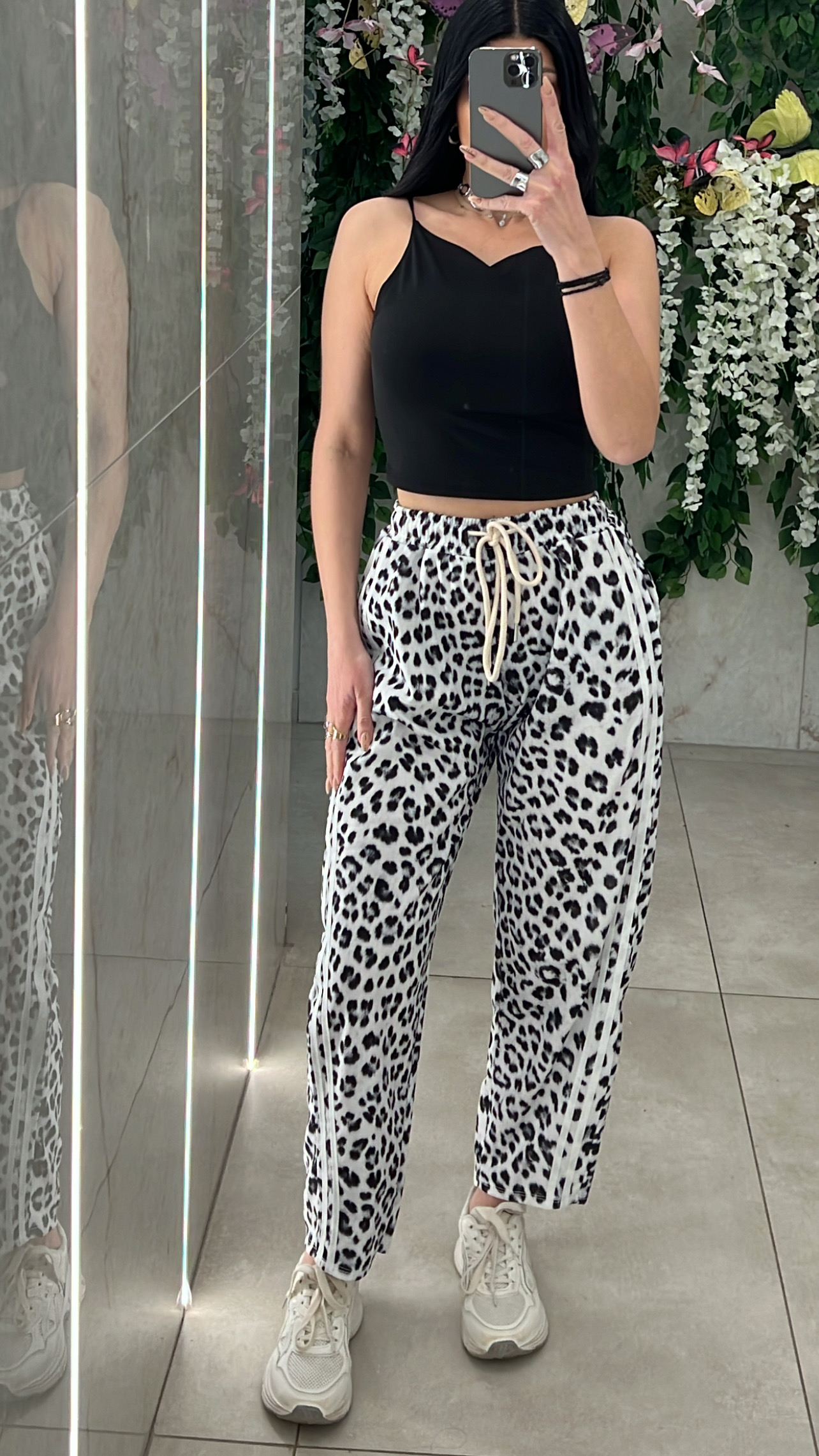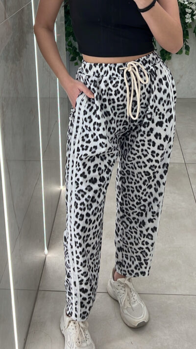 Φόρμα λεοπαρ με διπλη ριγα στο πλαι , διαθετει λάστιχο , κορδόνι και τσεπες στην μέση .