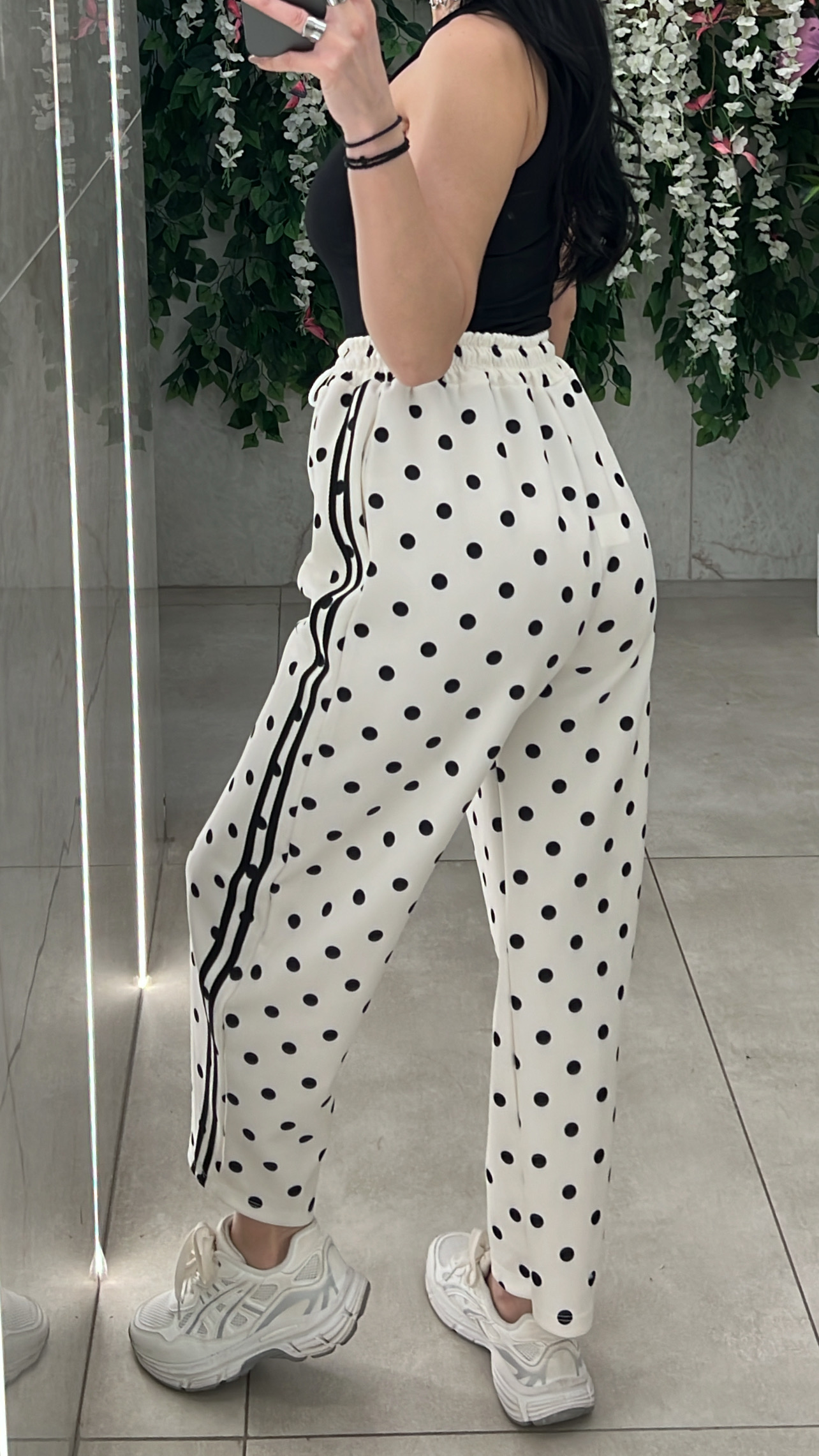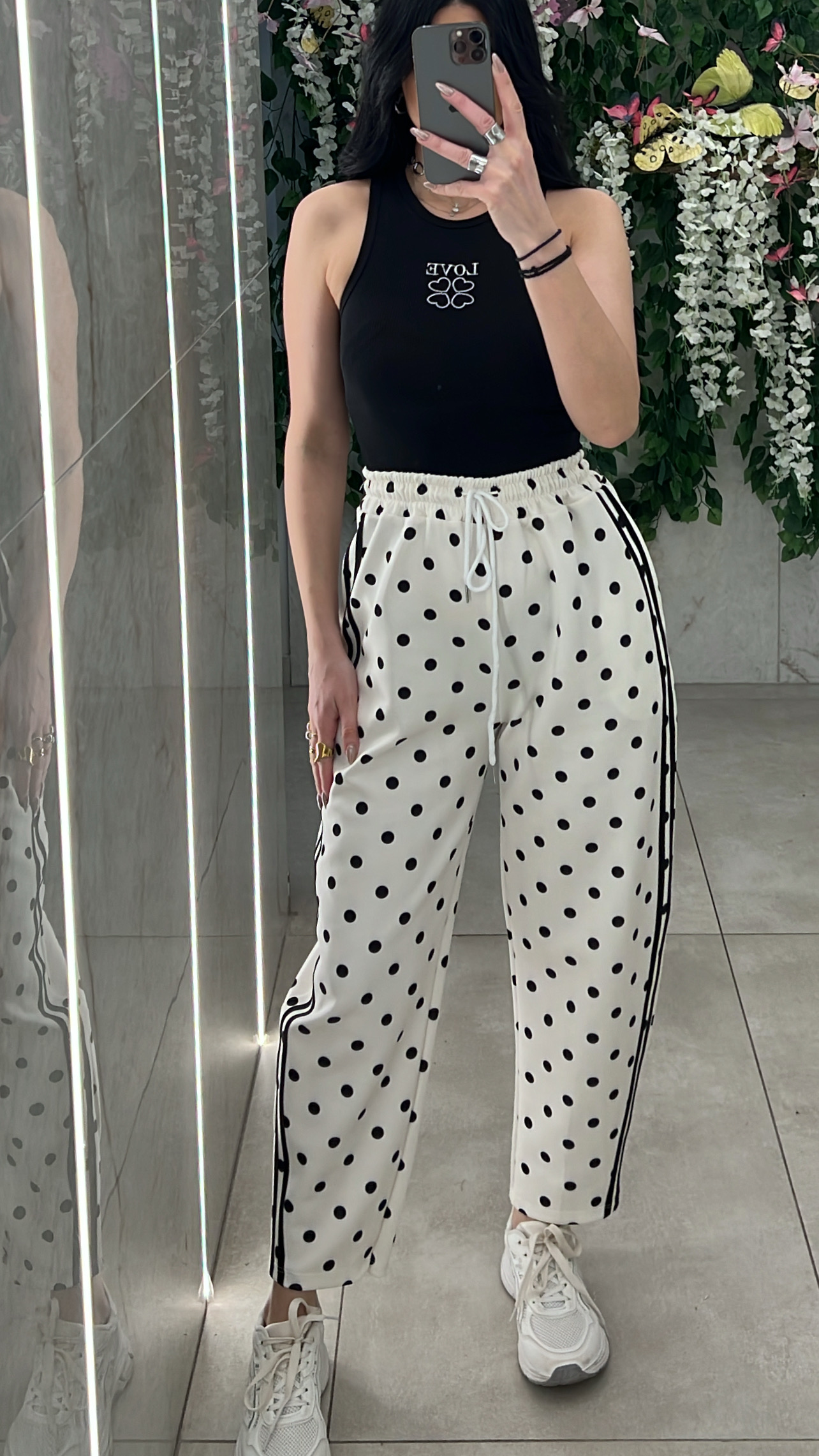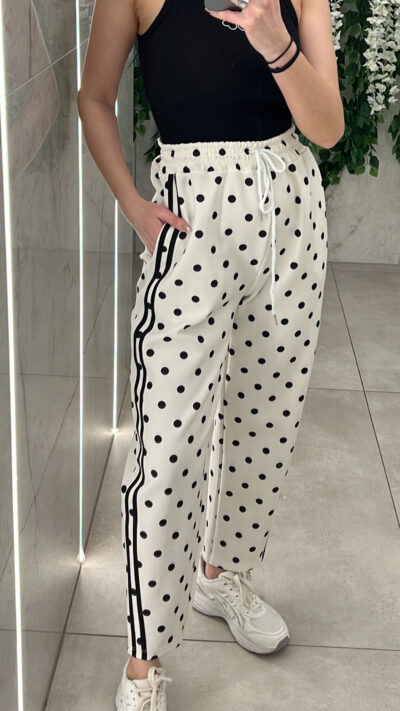 Φόρμα πουα με λάστιχο ,κορδόνι ,τσέπες στην μέση ,εχει ριγα στο πλαι και κανει σαν μπαλουν στο τελειωμα .