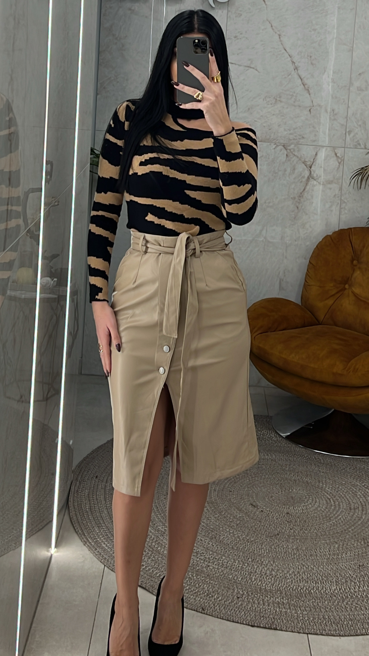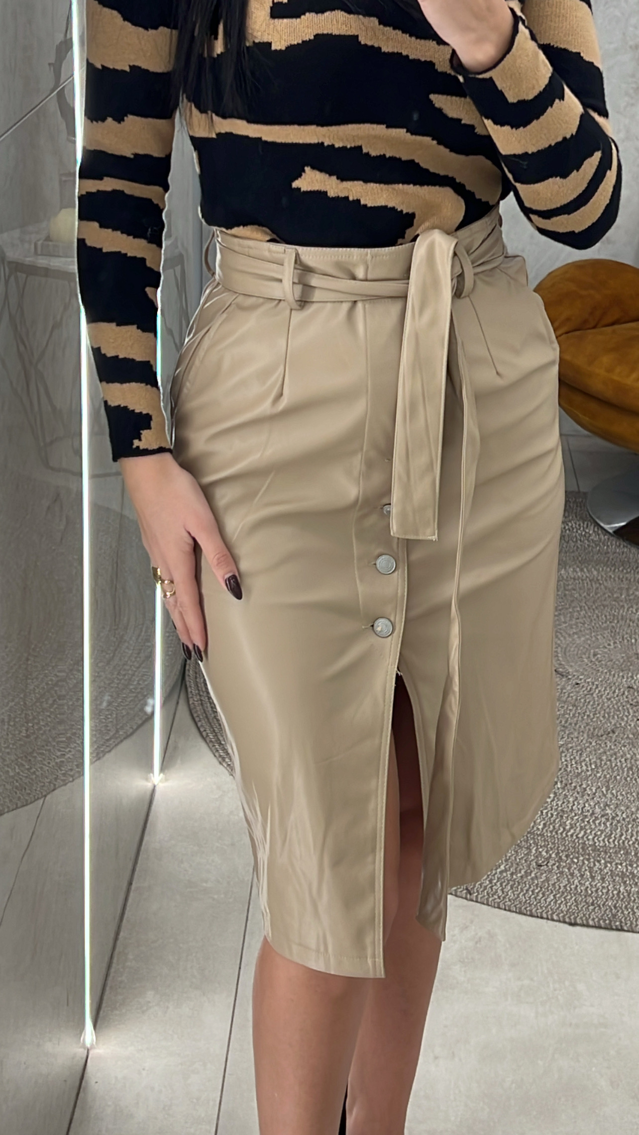 Φούστα Δερματίνη μπεζ με δική του ζώνη κλείνει με κουμπιά μπροστά  και έχει σκίσιμο έχει και τσέπες στα πλάγια
