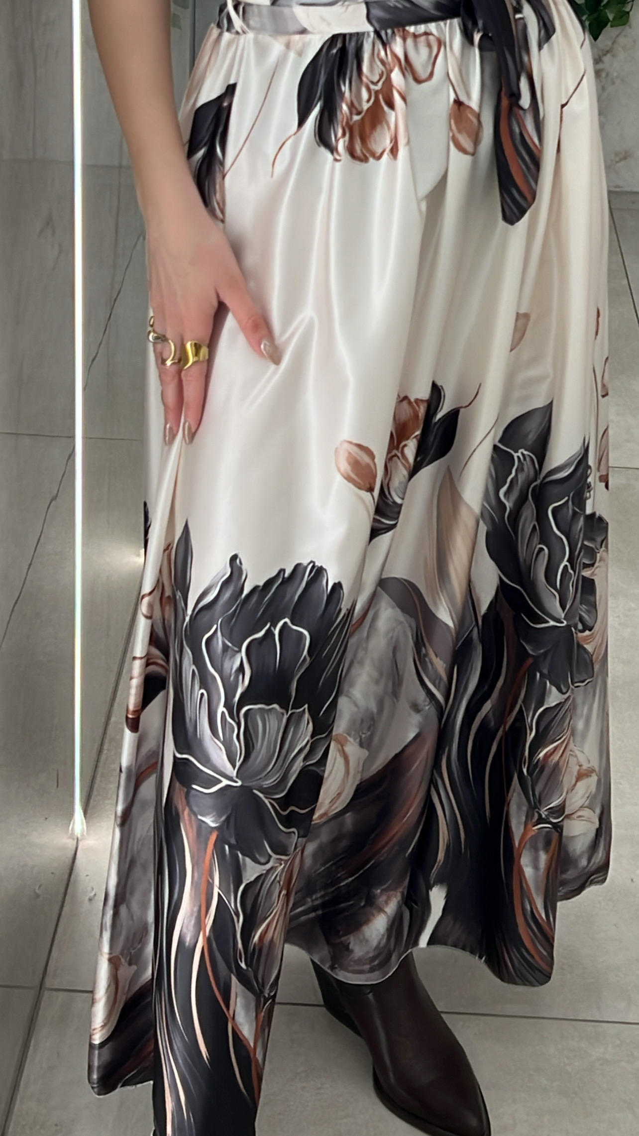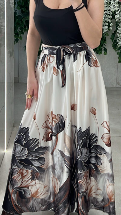 Φουστα φλοραλ σατεν με δικη του ζωνη και λάστιχο στην μέση .