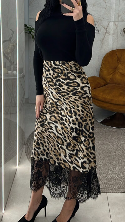 Φούστα σατέν λεοπάρ με δαντέλα στο τελείωμα και λάστιχο στη μέση