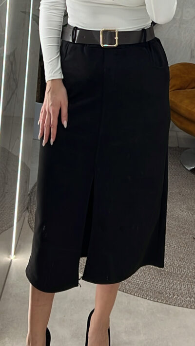 Φούστα midi με λάστιχο και δική της ζώνη, έχει σκίσιμο στο πόδι και διαθέτει και τσέπες.