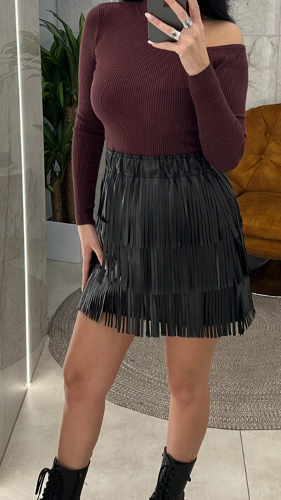 Φούστα μινι ψηλόμεση δερματίνη με λάστιχο στη μέση και κρόσια