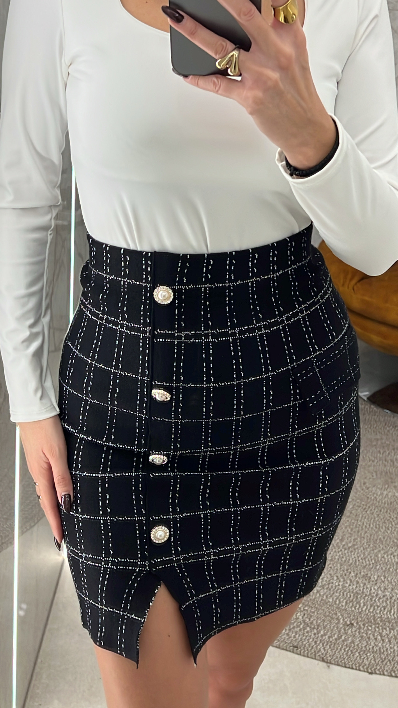 Φούστα πλεκτή καρό μαύρη με λάστιχο στην μέση και  χρυσά κουμπιά