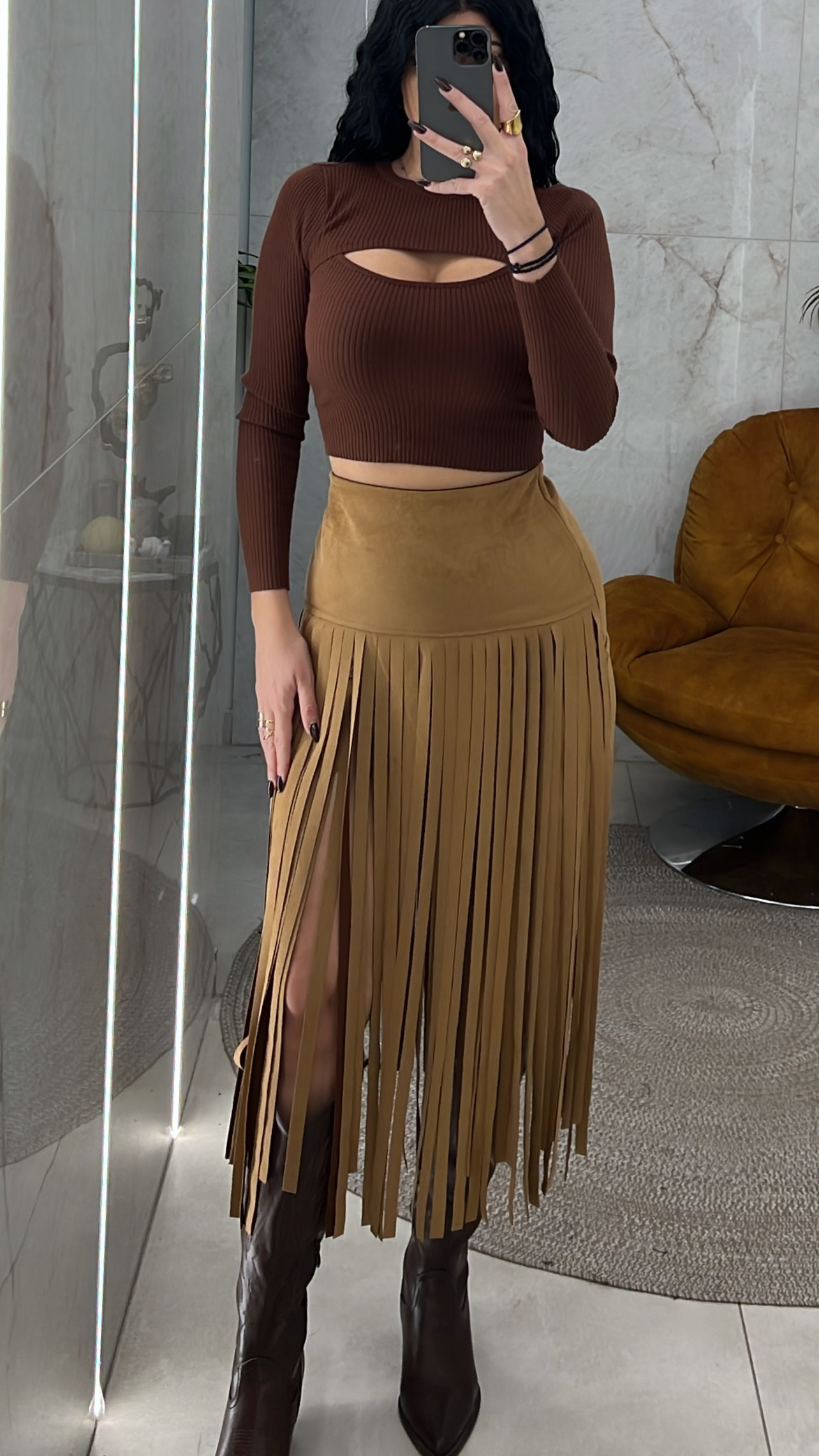 Φούστα σουέτ με κρόσια και λάστιχο στη μέση