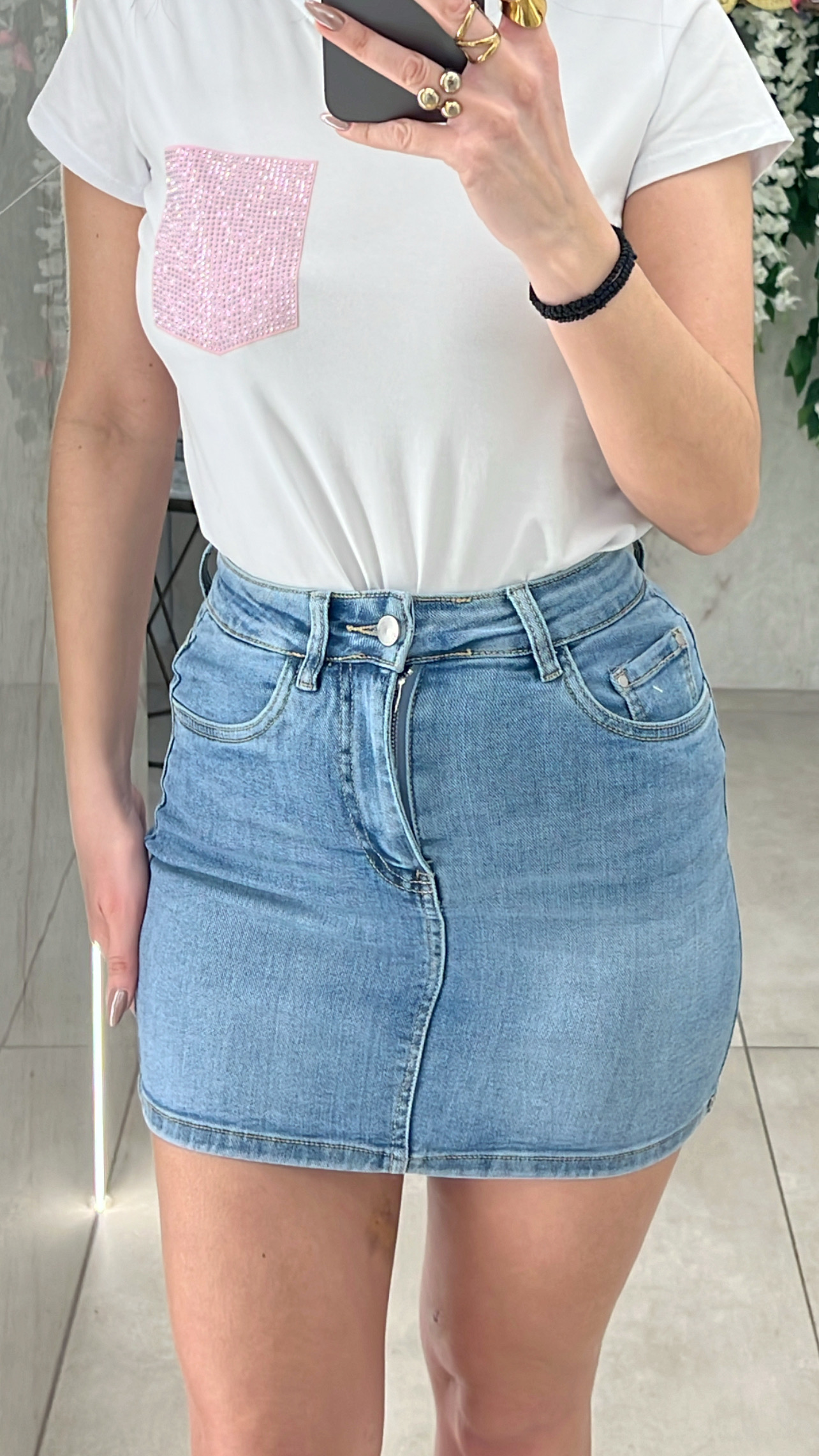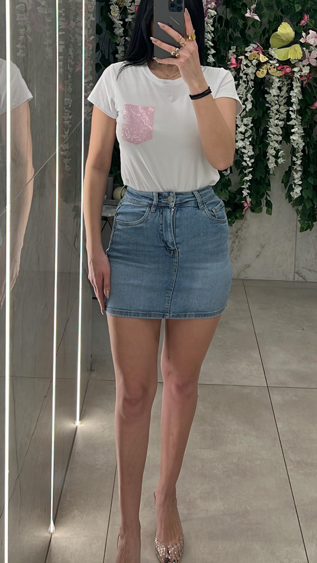 Φούστα τζιν κοντη ,εχει  τσέπες πισω με στρας και κλεινει με κουμπι μπροστά.