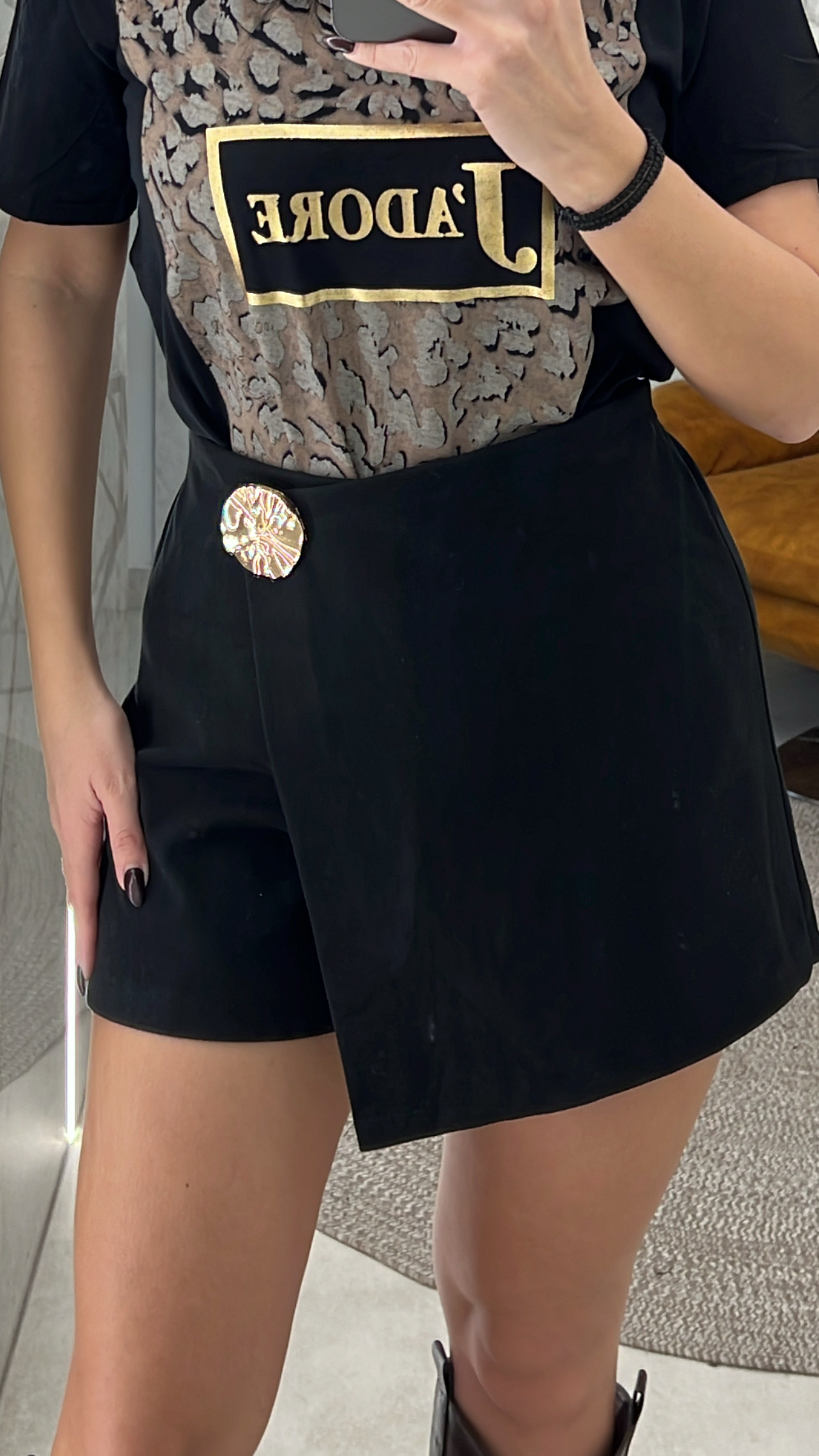 Φουστοσορτσάκι σουέτ μαύρο με λάστιχο στη μέση στο πίσω μέρος και διακοσμητική αγκράφα χρυσή μπροστά