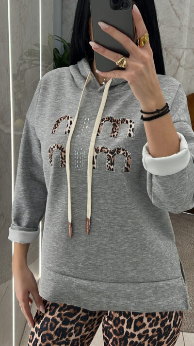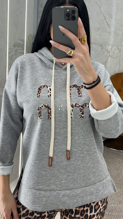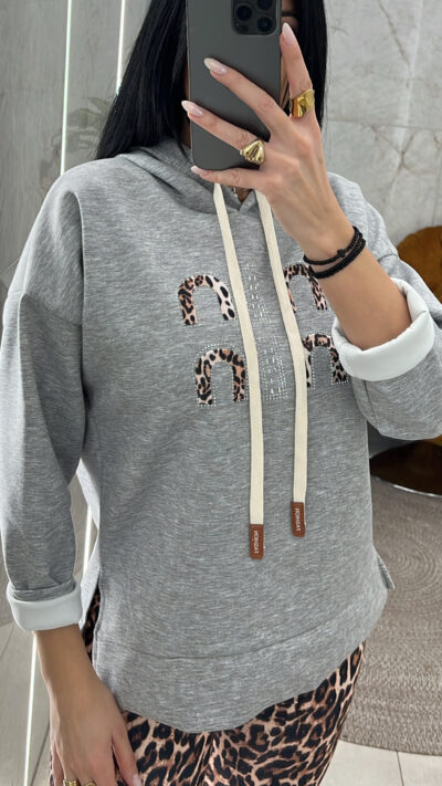 Φούτερ λεπτή μπλούζα με κουκούλα ανοίγματα στο πλάι και animal print λεπτομέρειες και στρας