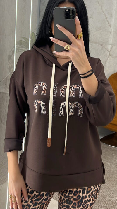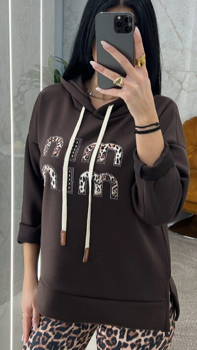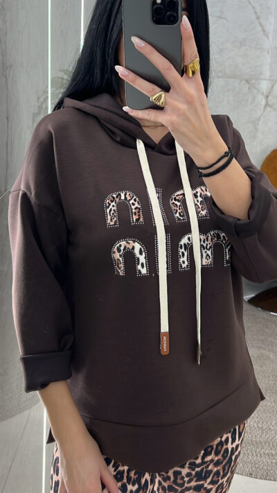 Φούτερ λεπτή μπλούζα με κουκούλα ανοίγματα στο πλάι και animal print λεπτομέρειες και στρας
