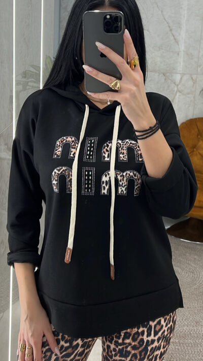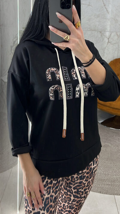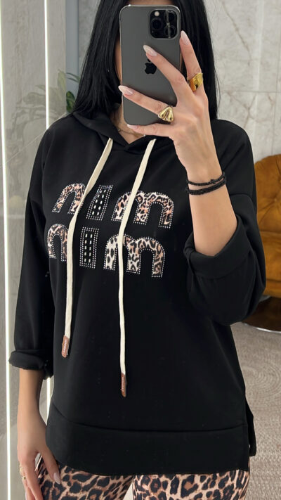 Φούτερ λεπτή μπλούζα με κουκούλα ανοίγματα στο πλάι και animal print λεπτομέρειες και στρας