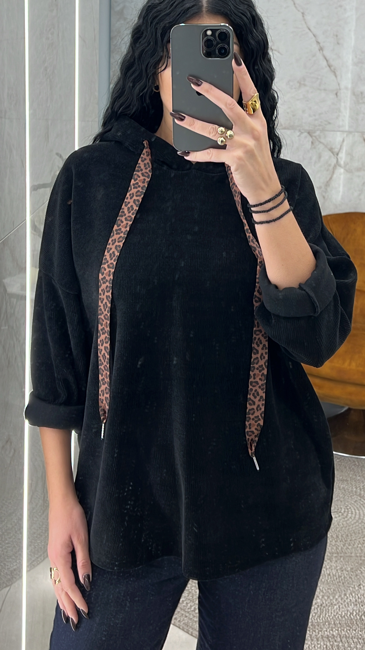 Φούτερ  κοτλέ με κουκούλα  και λεοπάρ λεπτομέρειες