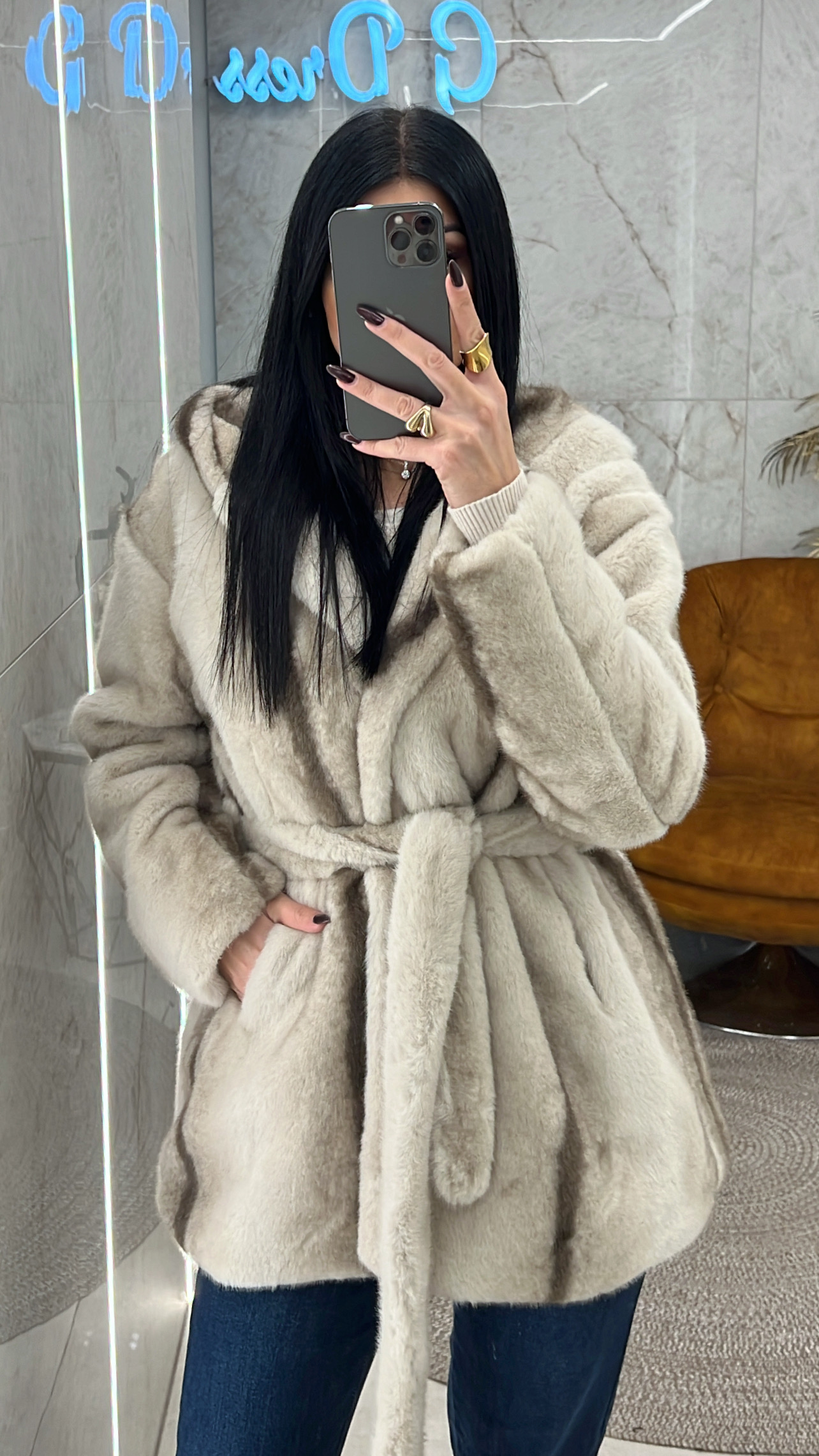 Γούνα οικολογική με κουκούλα έχει δική της ζώνη τσέπες και είναι φοδραρισμένη