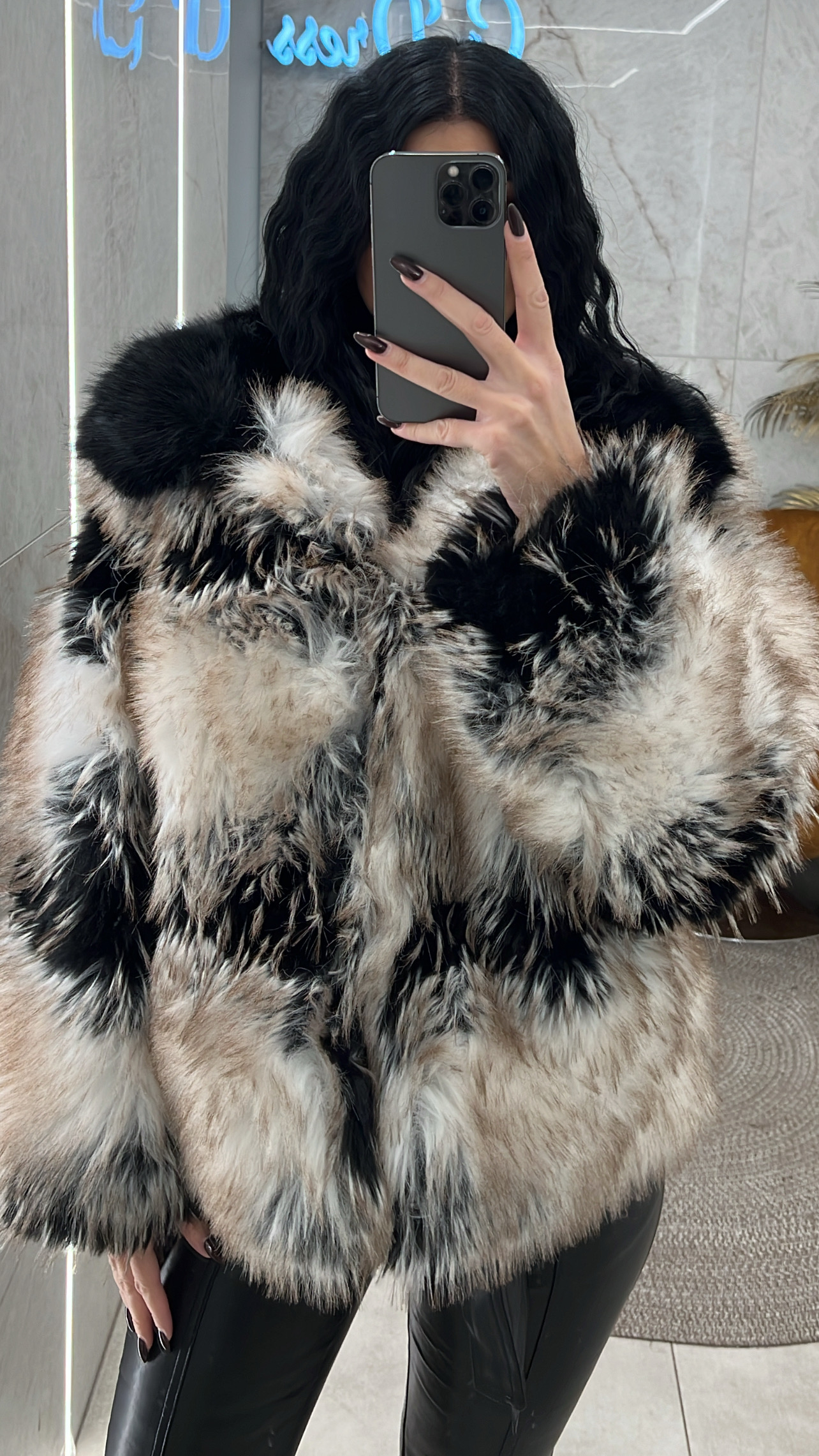 Γούνα συνθετική φοδραρισμένη με αποχρώσεις του μαύρο και μπεζ. Κλείνει με κόπιτσα