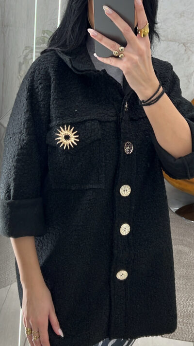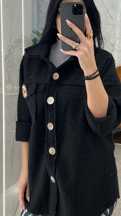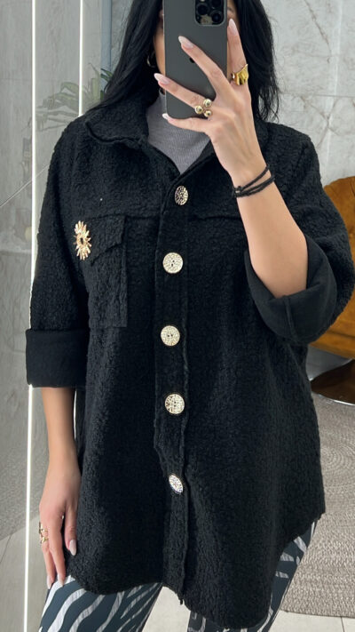 Jacket Teddy τσόχα λεπτό κλείνει με χρυσά κουμπιά  και έχει τσέπη με αγκράφα χρυσή στο στήθος
