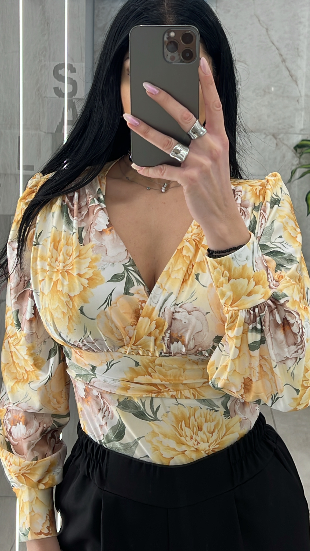 Κορμάκι floral μακρυμάνικο  με κόψιμο κρουαζέ και κάπς στο στήθος.