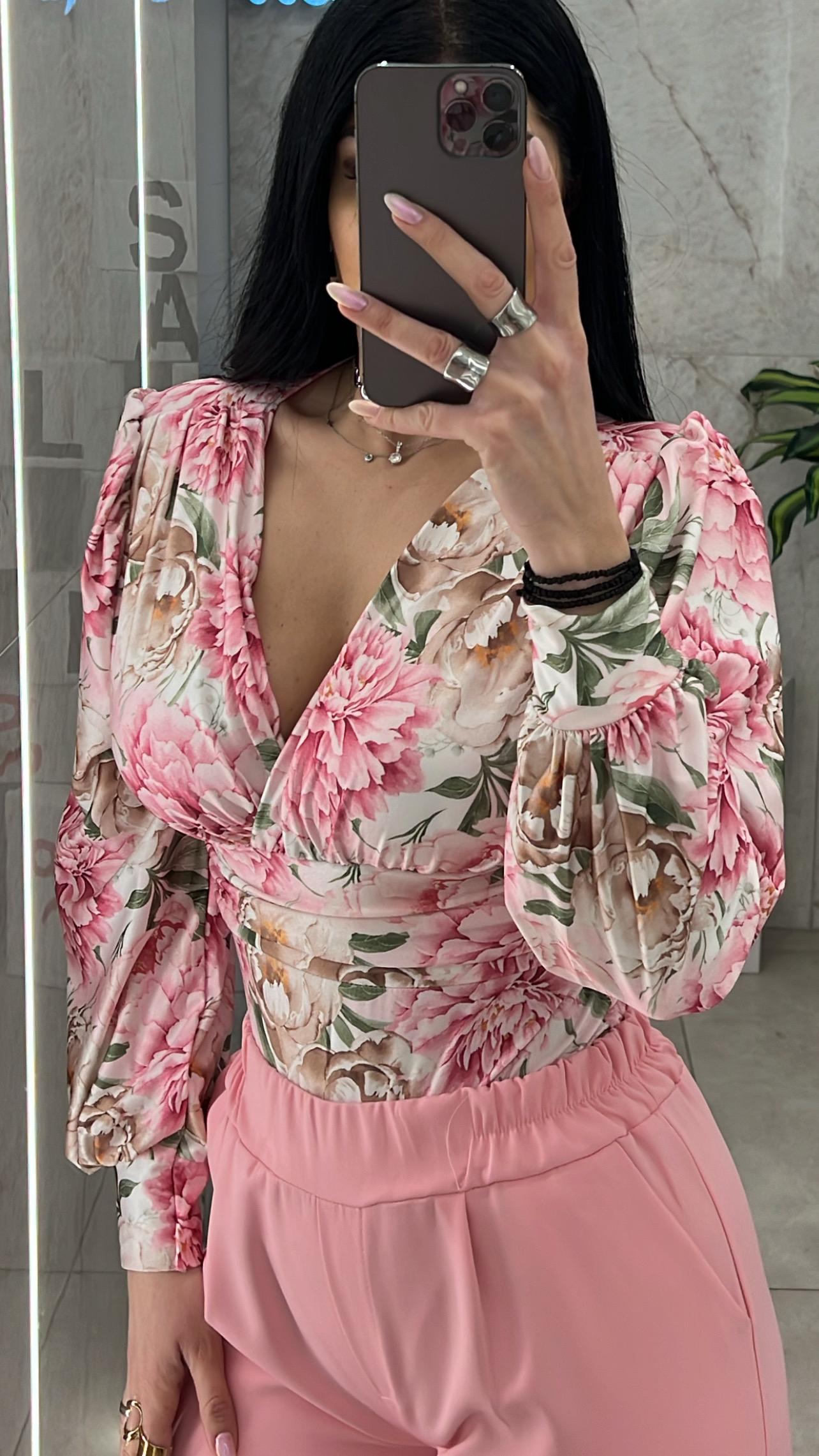 Κορμάκι floral μακρυμάνικο  με κόψιμο κρουαζέ και κάπς στο στήθος.