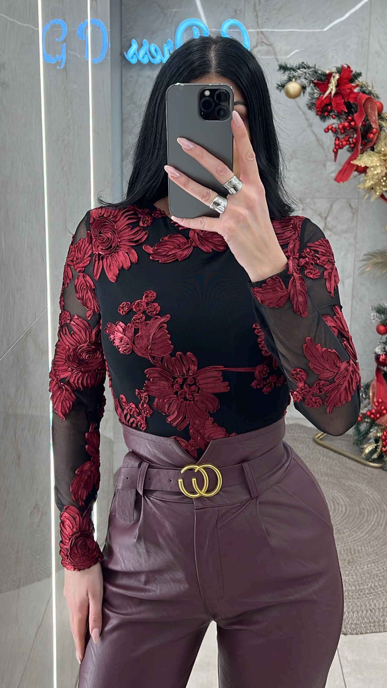 Κορμάκι με ανάγλυφα λουλούδια 35449/Μπορντό