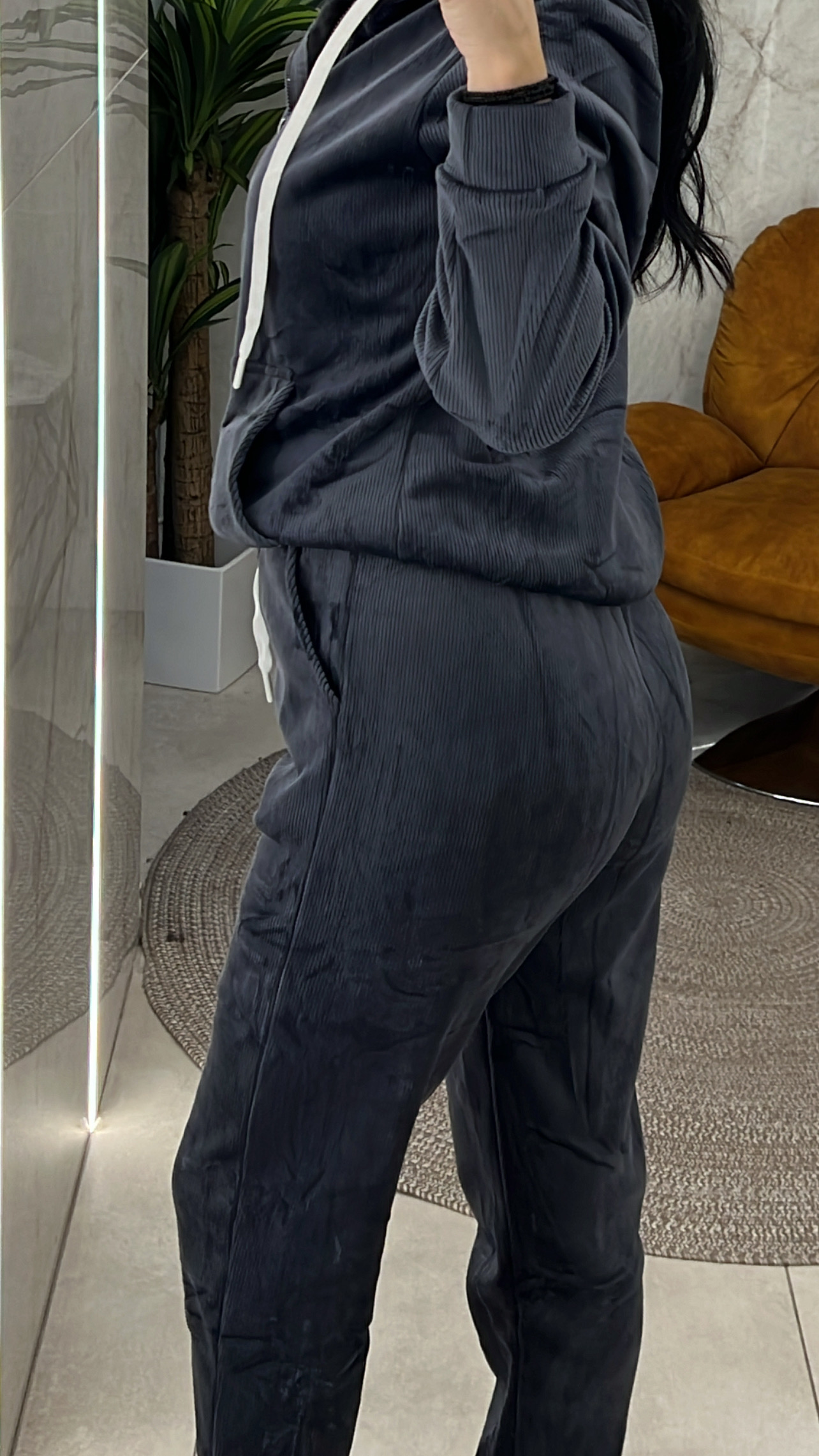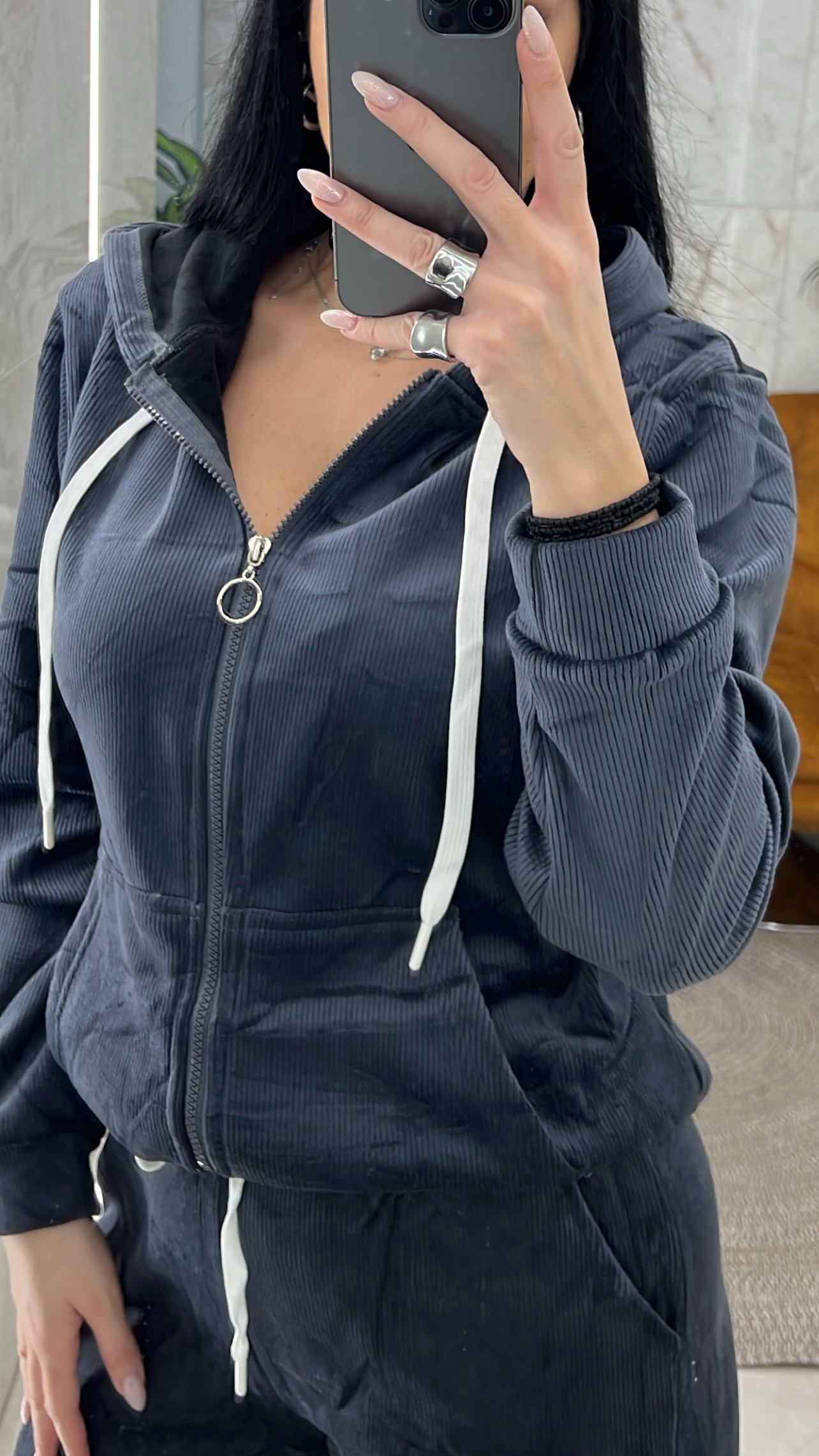 Σετ φόρμας κοτλέ παντελόνι με λάστιχο στη μέση και κορδόνι και ζακέτα με κουκούλα και τσέπες μπροστάn έχει εσωτερικό φλις