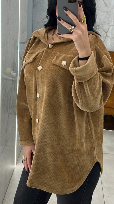Κοτλέ μαλακό πουκάμισο σε άνετη γραμμή με χρυσά κουμπιά και κουκούλα.