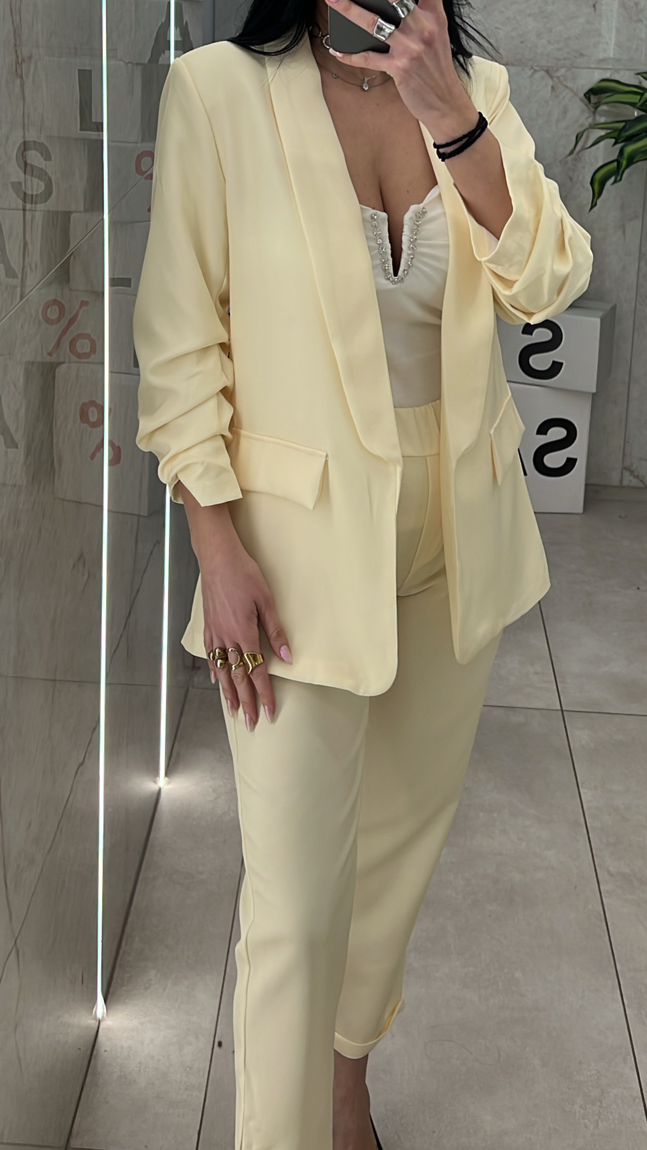 Κοστούμι με σούρα στα μανίκια το σακάκι είναι φοδραρισμένο και το παντελόνι έχει λάστιχο στην μέση και τσέπες
