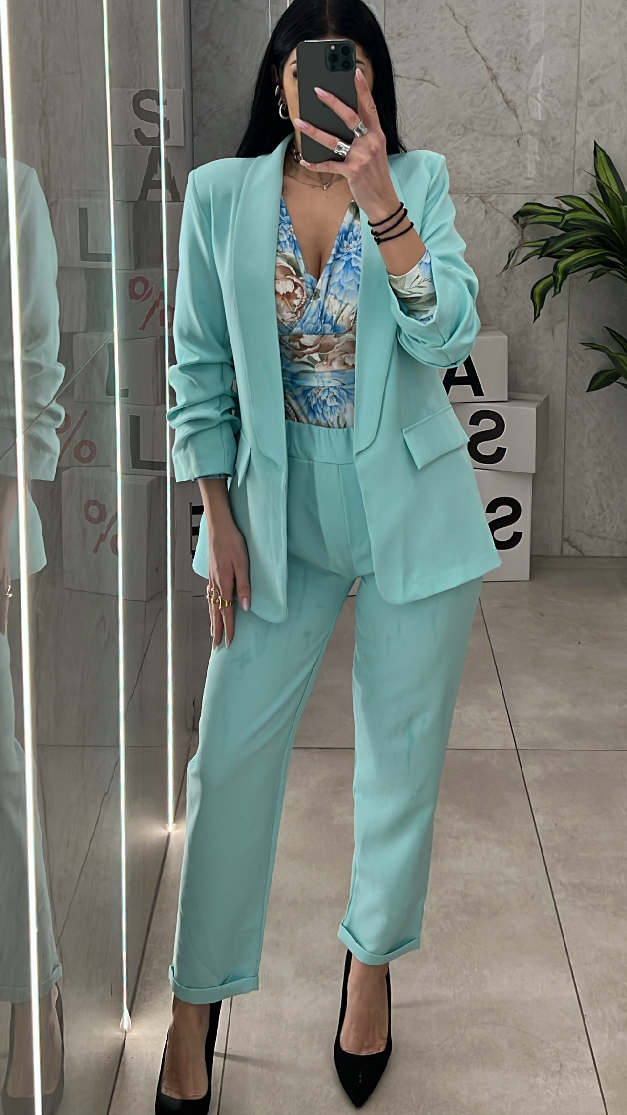 Κοστούμι με σούρα στα μανίκια το σακάκι είναι φοδραρισμένο και το παντελόνι έχει λάστιχο στην μέση και τσέπες