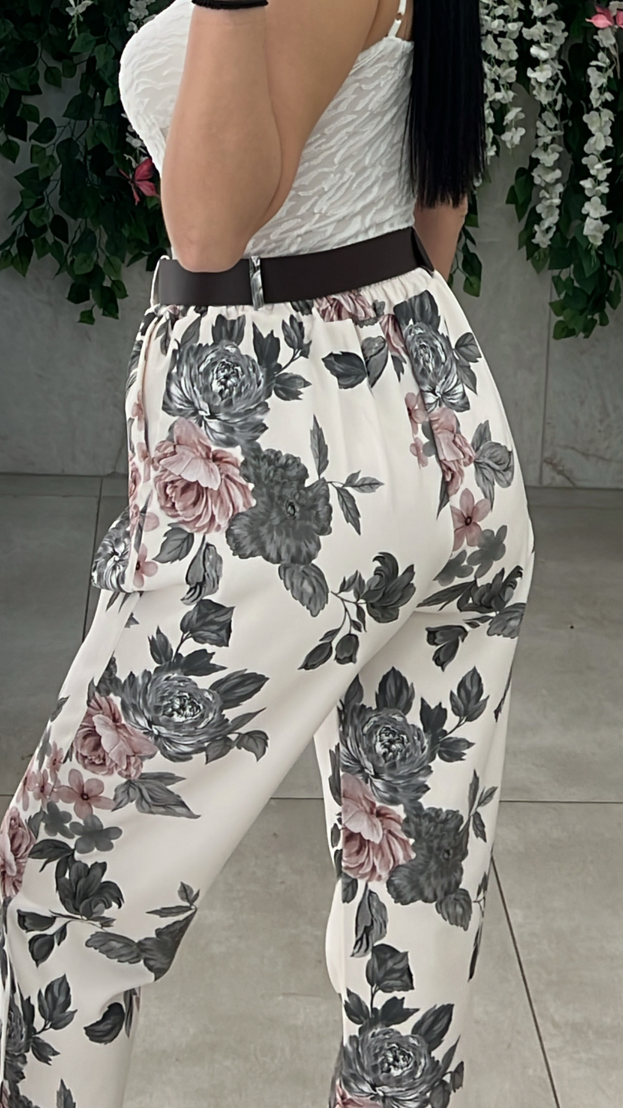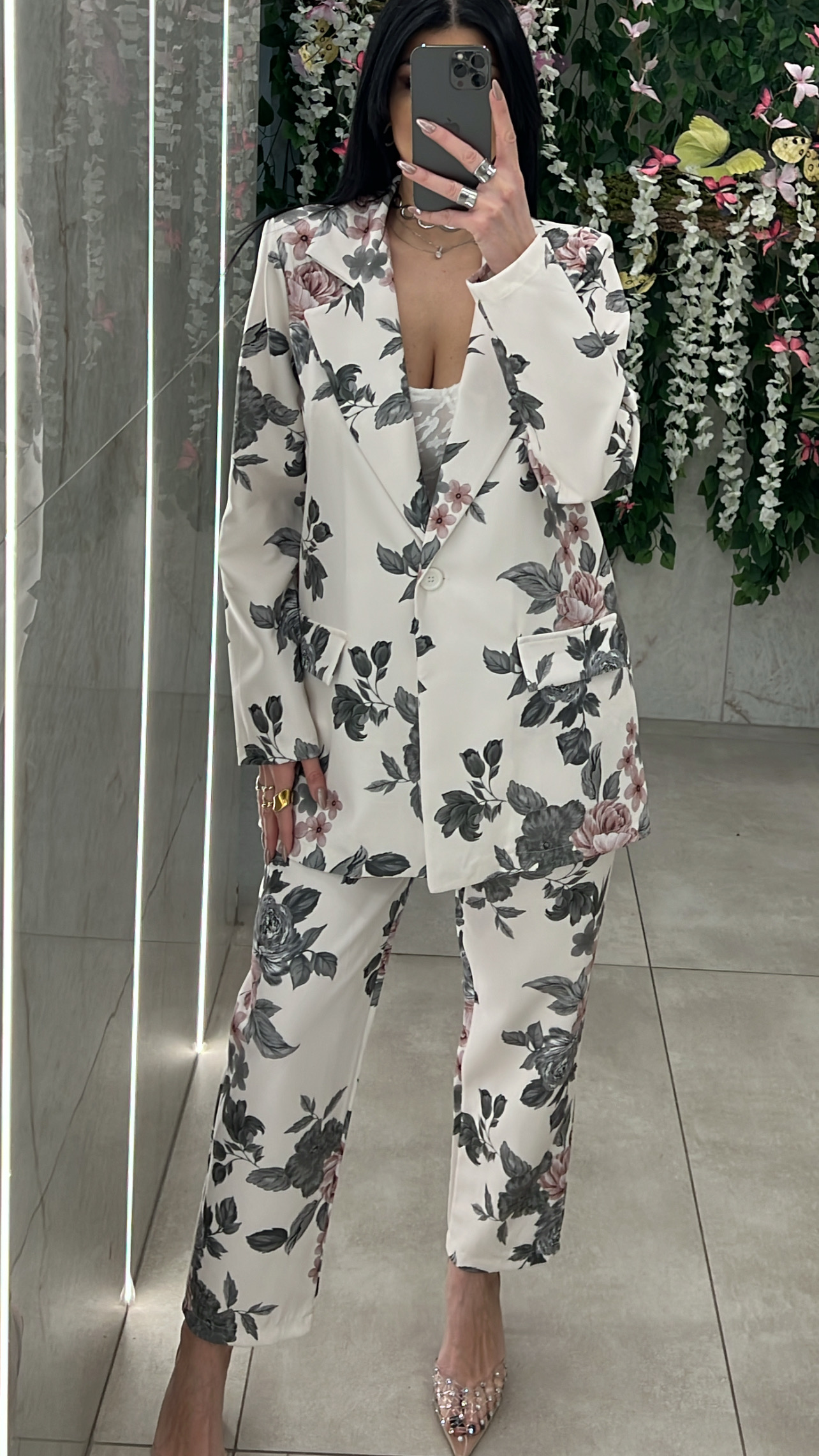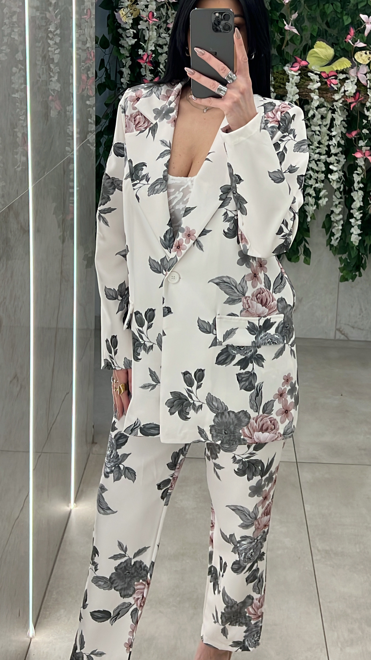 Σετ κουστουμι φλοράλ ,σακάκι με βάτες και κουμπί ,παντελόνα με δική της ζώνη ,λάστιχο στην μέση και τσέπες .