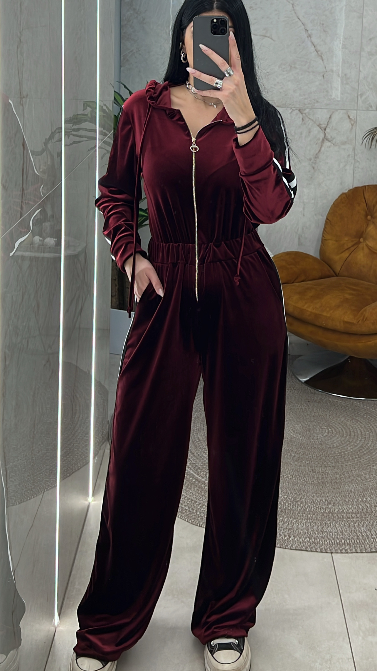 Ολόσωμη φόρμα βελουτέ με λευκή ρίγα στο πλάι κουκούλα και λάστιχο στη μέση , κλείνει με φερμουάρ μπροστα και έχει τσέπες.