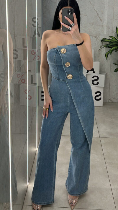 Ολόσωμη τζιν παντελόνα στράπλες με χρυσά κουμπιά στο στήθος και κλείνει με φερμουάρ στην πλάτη .