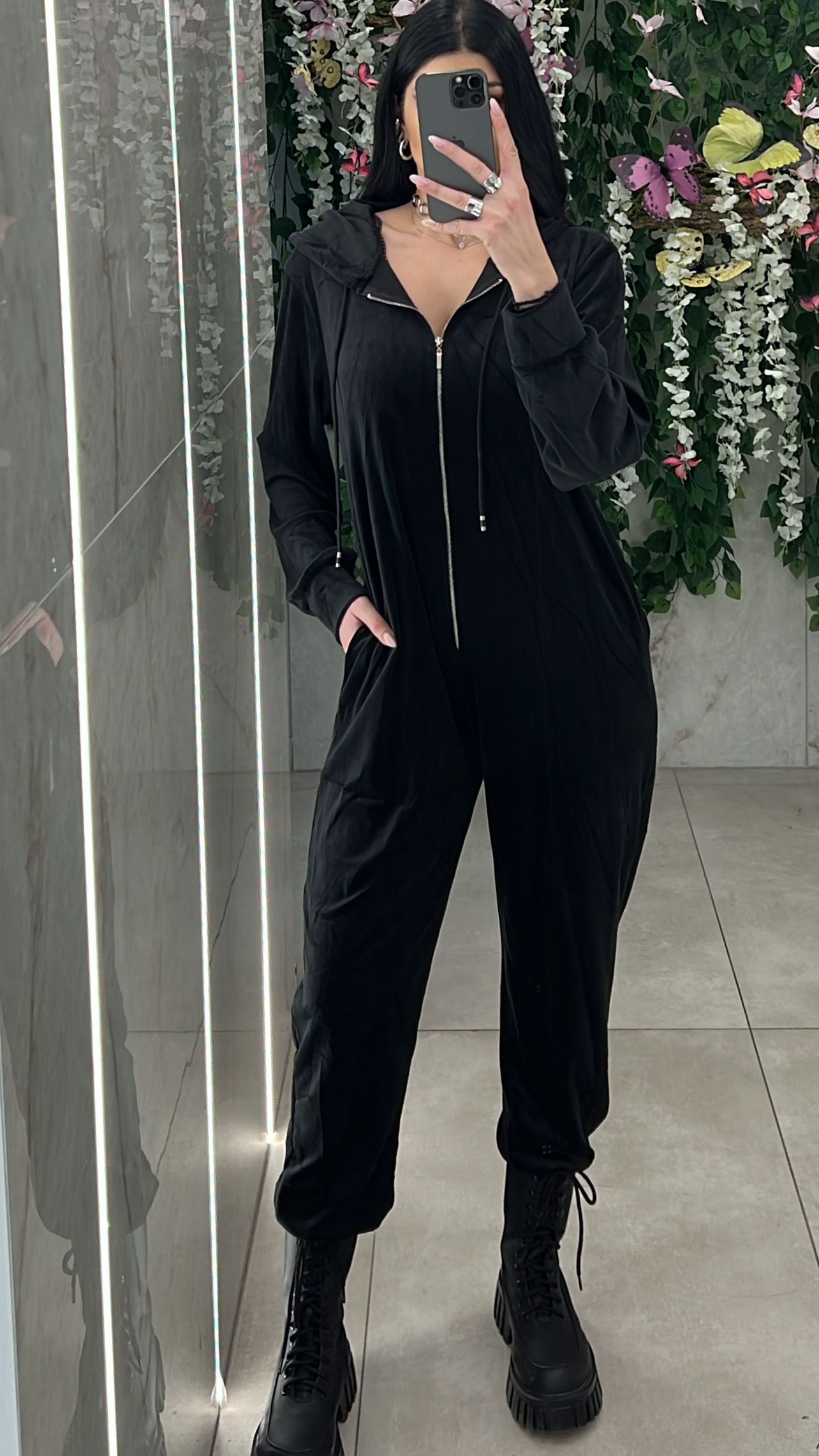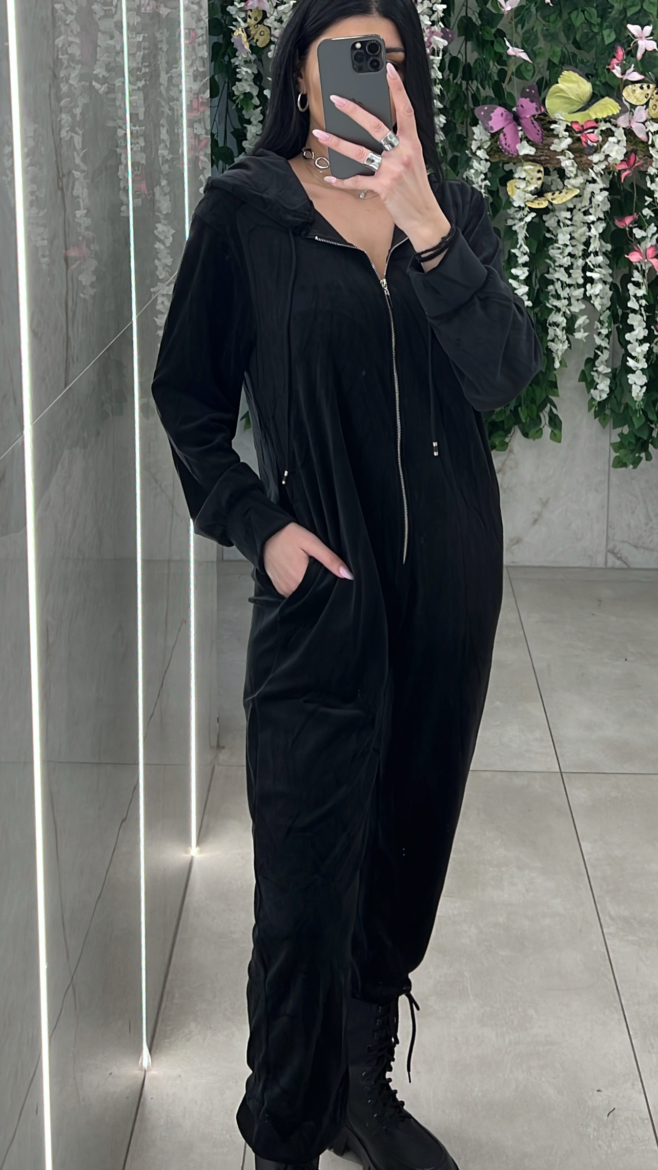 Ολόσωμη βελουτέ με κουκούλα που έχει αυτάκια , κλείνει μπροστά με φερμουάρ,διαθέτει τσέπες και εχει λάστιχο στο τελείωμα .